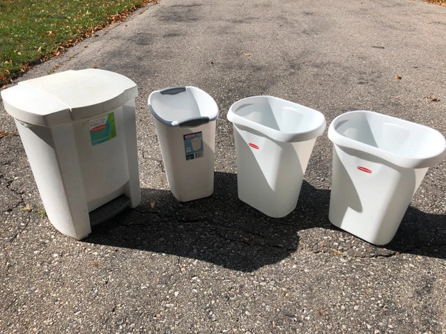 I'm offering a selection of used Rubbermaid trash cans, perfect for any room in your home or office. This lot includes a step-on can with a lid and 3 standard open top waste bins, ready to handle your disposal needs. Specifications: * Includes: 1 step-on trash can, 3 open top waste bins * Condition: Used, but in good working order * Material: Durable plastic Looking to declutter and simplify your waste management? These trusty bins are up for the task! Get in touch and give these cans a new home. By the way, if the ad is up, the item is available!