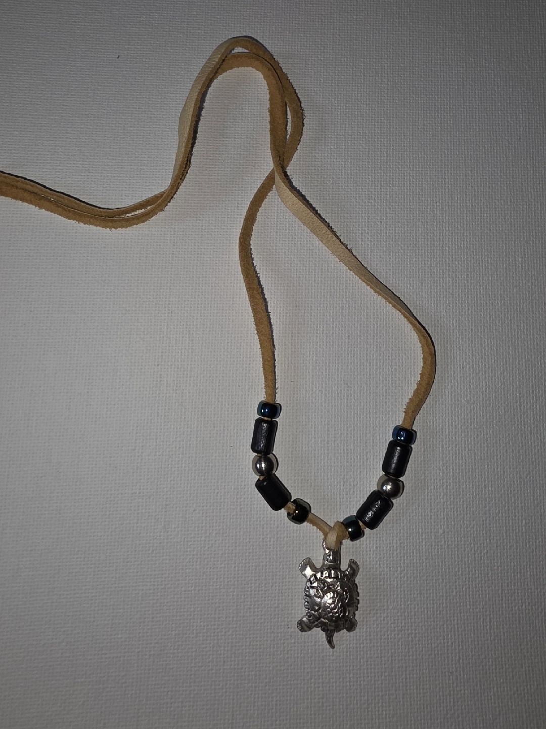 Cute turtle pendant necklace with a tan cord and black and silver beads. The pendant is silver in colour and has a lot of detail. Perfect for adding a bit of fun to any outfit! pickup near High Park Station.