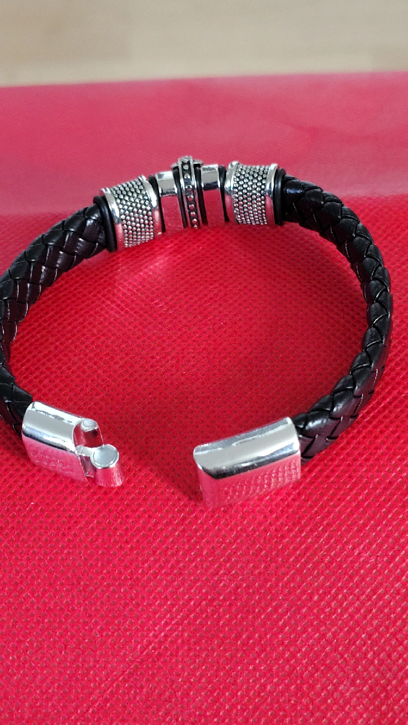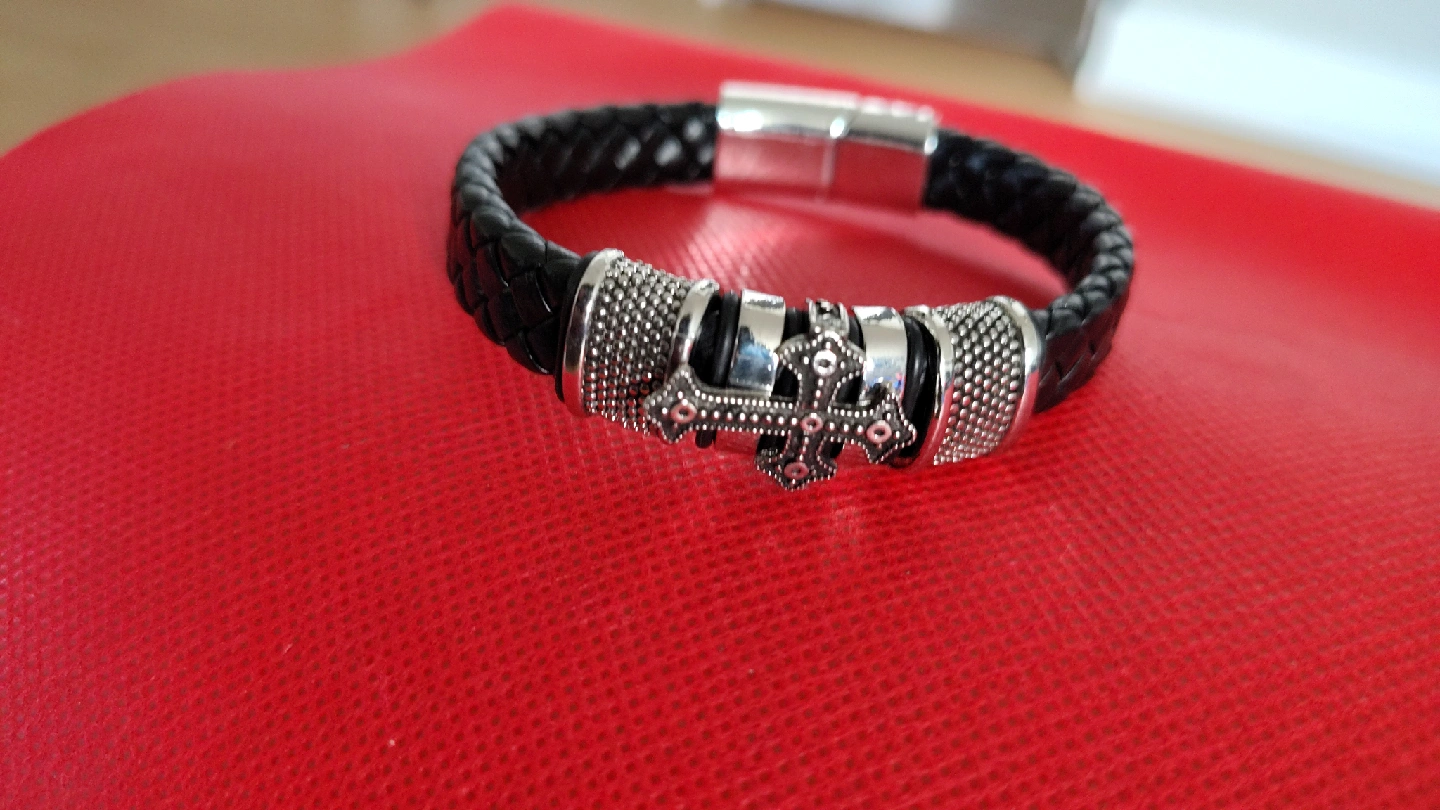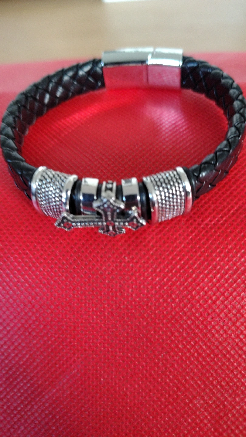 Stylish braided leather bracelet with silver accents. It features a magnetic clasp for easy wear and a unique cross design. Perfect for adding a touch of edge to any outfit!
