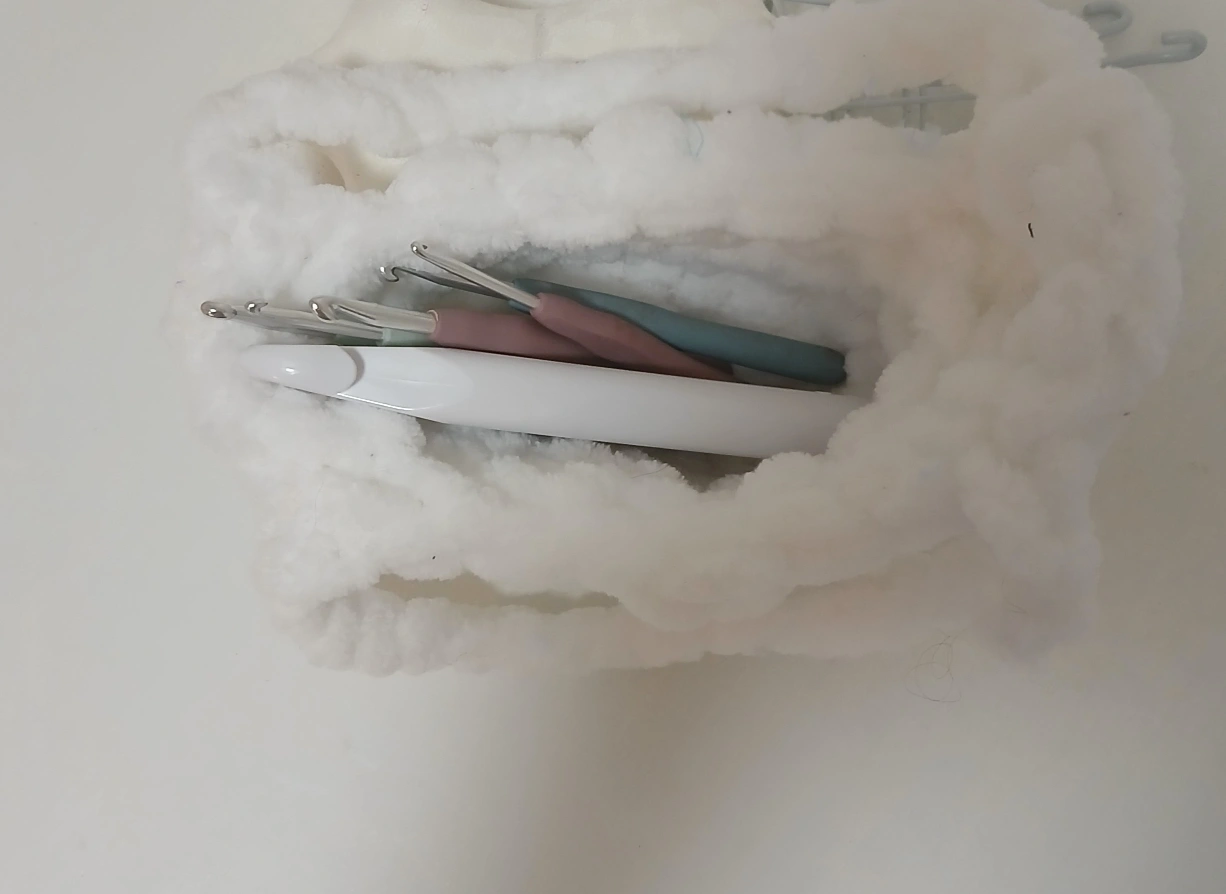 Selling a set of crochet hooks with some fluffy white yarn! Great for starting a new project or adding to your collection