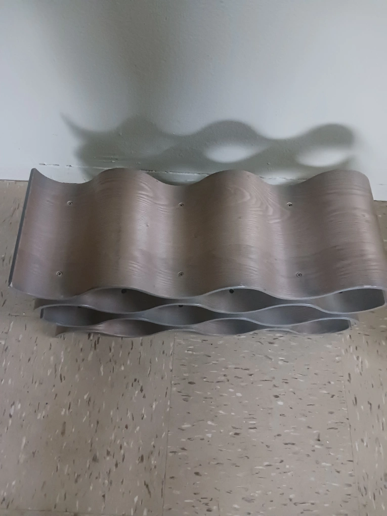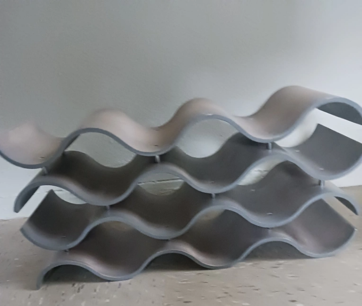 This wine rack is perfect for storing your favorite bottles in a stylish way! It has a unique wavy design and a neutral color that will complement any home decor