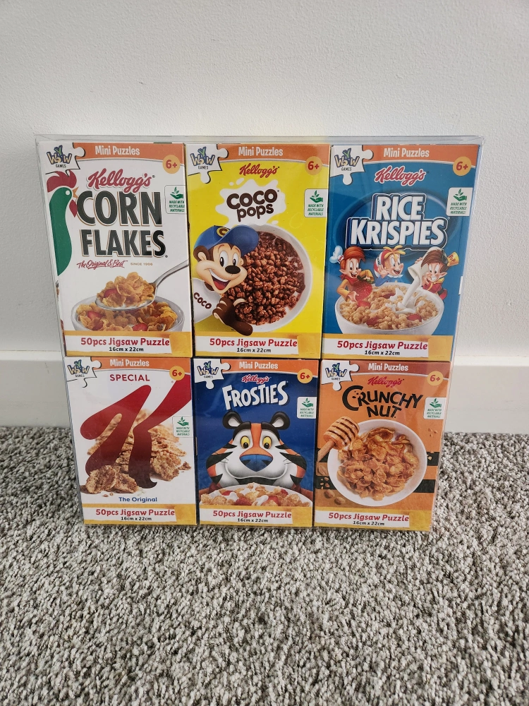 Selling a set of brand new Kellogg's miini puzzles. This pack includes 6 different styles of cereal box puzzles. Each puzzle is 50 pieces and measures 15cm x 22cm. Comes from a smoke and pet free home.