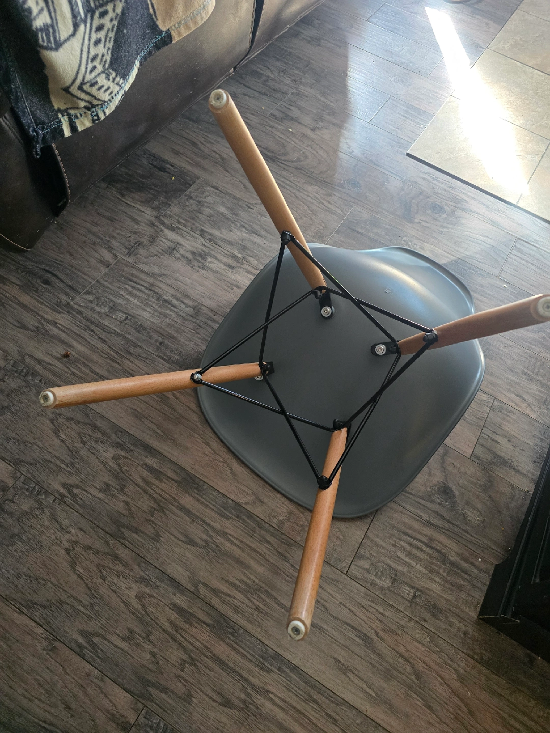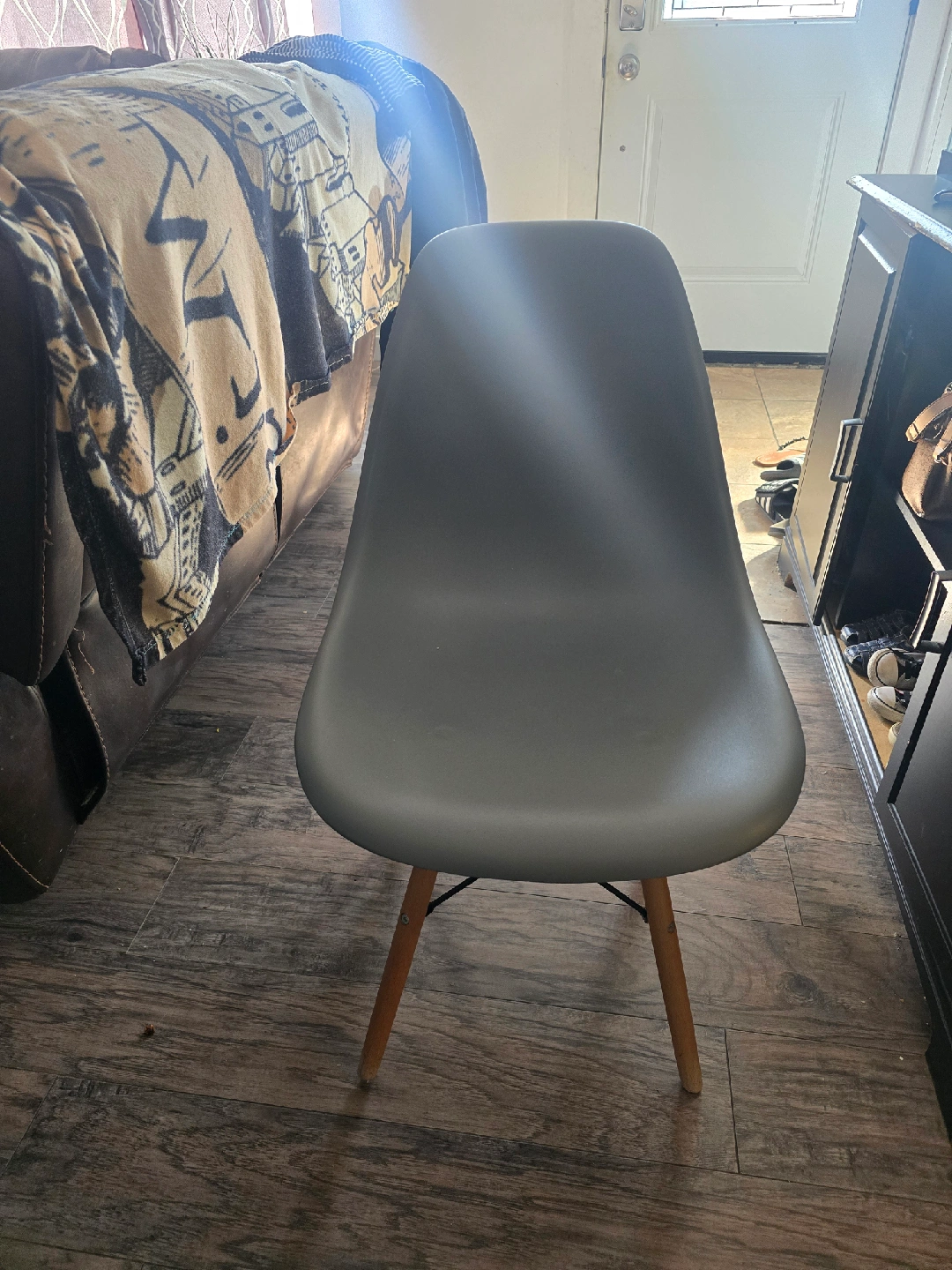Selling a modern-style dining chair in grey. It has a sleek design and wooden legs. Great for adding a touch of style to your dining area or any room in your home $15