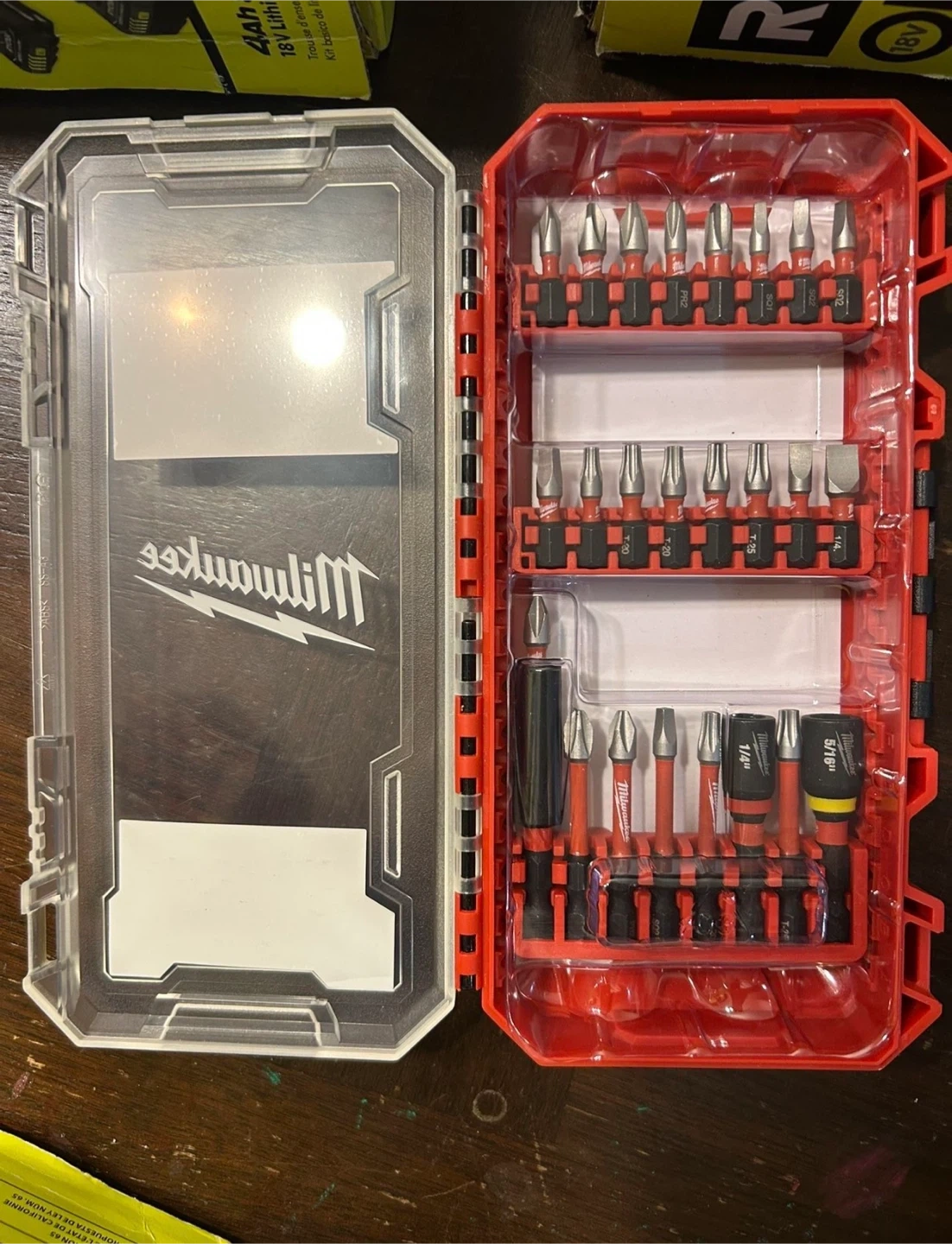 Selling a Milwaukee 25-piece impact driver bit set. It's designed for use in PACKOUT and features a wear guard tip. This Shockwave Impact Duty set protects the fit over the life of the bit