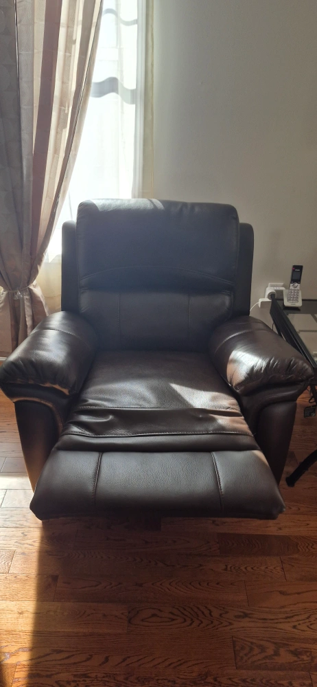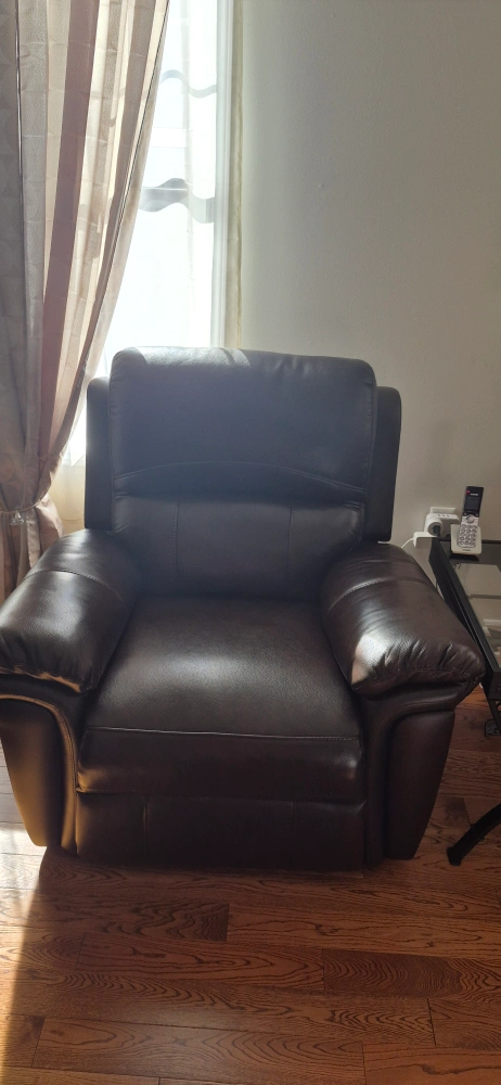 Selling a comfy brown leather match recliner chair. It's in like NEW condition (1 year old) and perfect for relaxing after a long day. The recliner function is manual using the lever at the side of the sofa. It would be a great addition to any living room or den. This is a leather match sofa meaning it is all leather except for the bottom sides and back of the sofa which is vinyl. Must be able to pick up the sofa from my home in Whitby.
