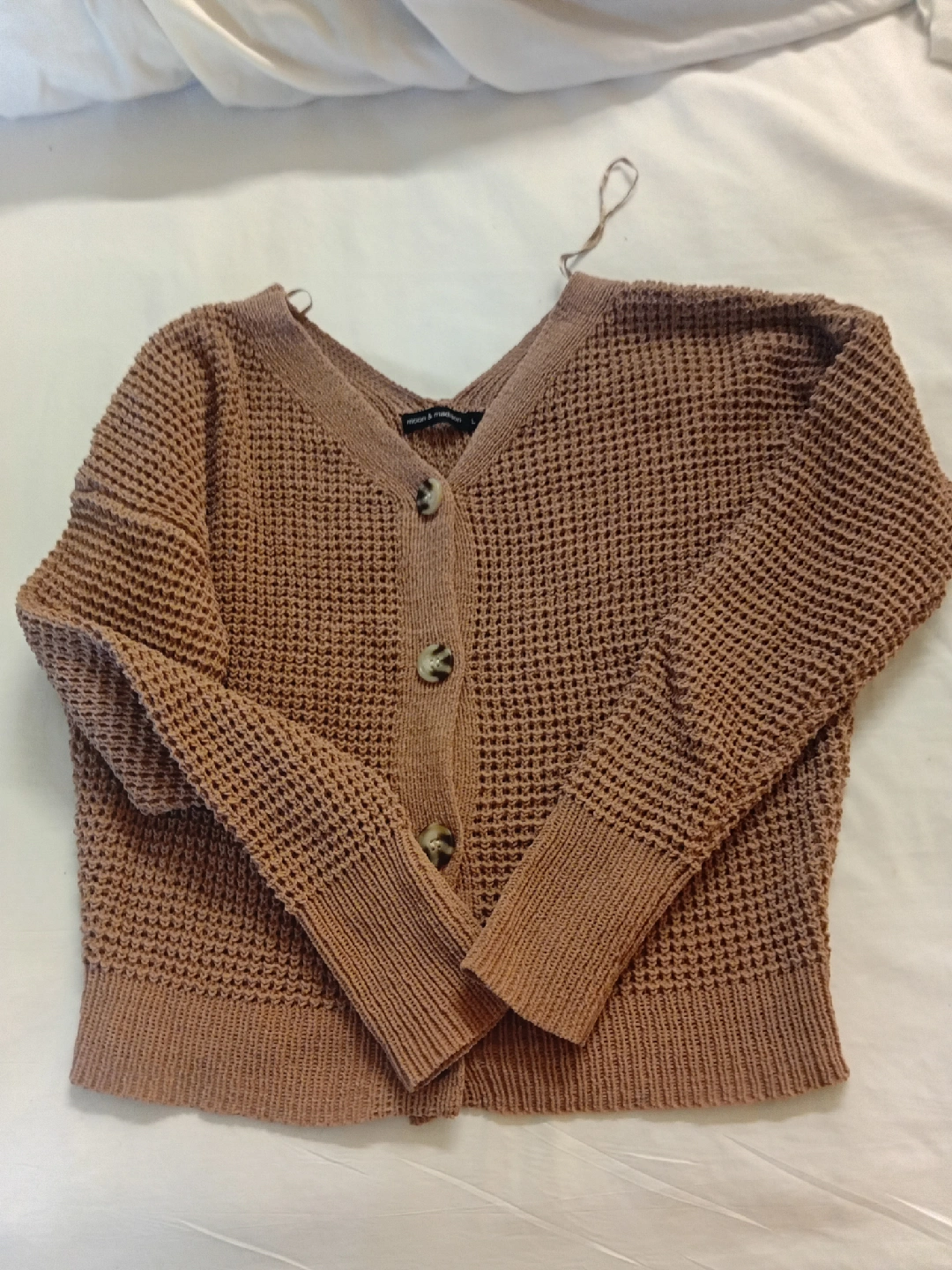 Cozy up in this stylish Moon & Madison knit cardigan! It's a lovely brown colour and a size large. Perfect for layering on those cooler days!