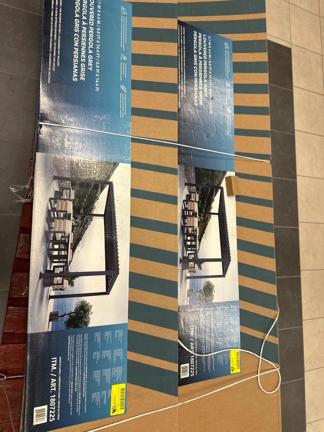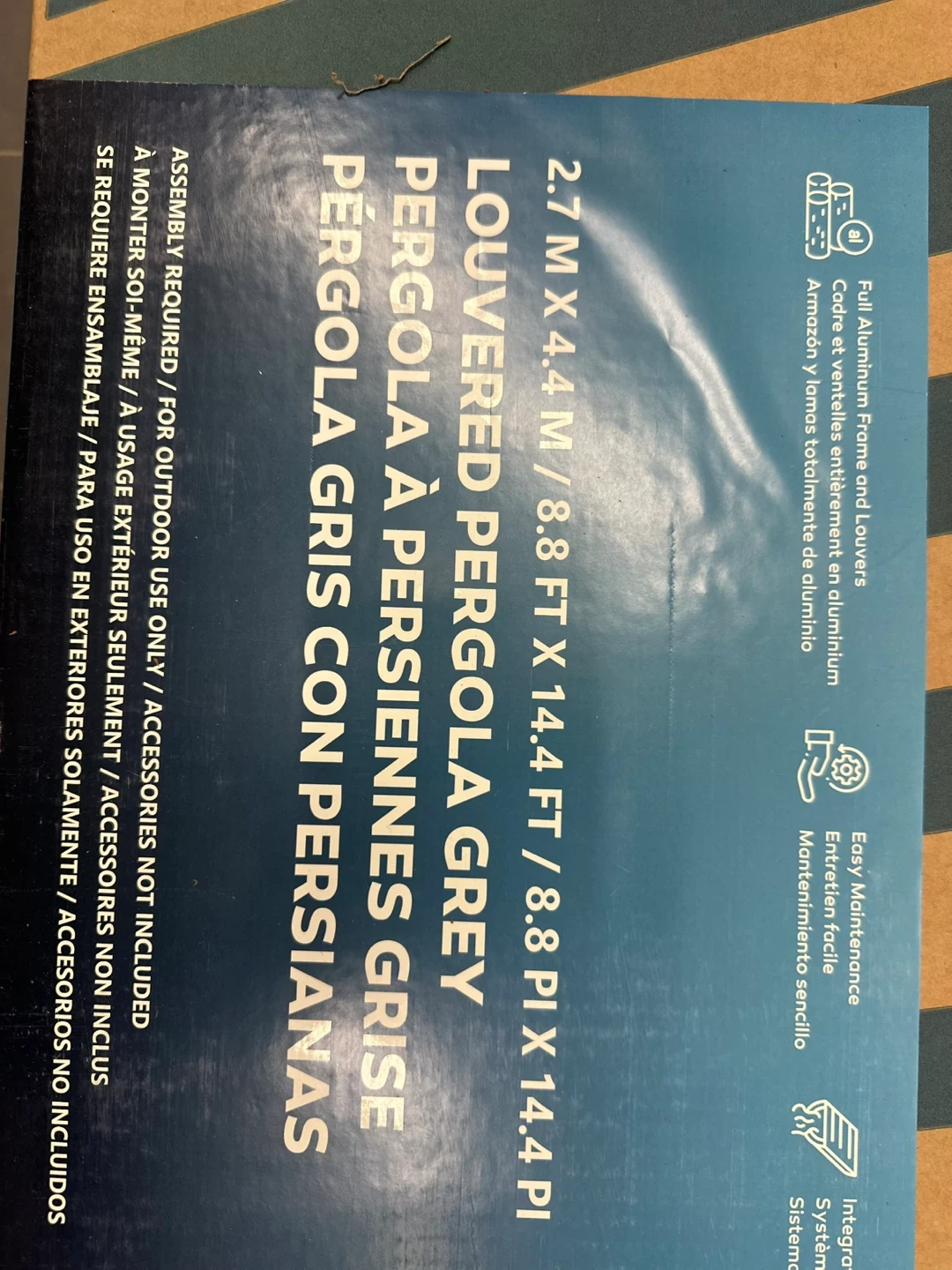 Selling a Louvered Pergola in grey. It measures 2.7 m x 4.4 m / 8.8 ft x 14.4 ft. It has an aluminum frame and louvers, and is easy to maintain. Assembly is required and accessories are not included. Perfect for outdoor use! Pickup - 46 Pinebush Road TK HOME CAMBRIDGE