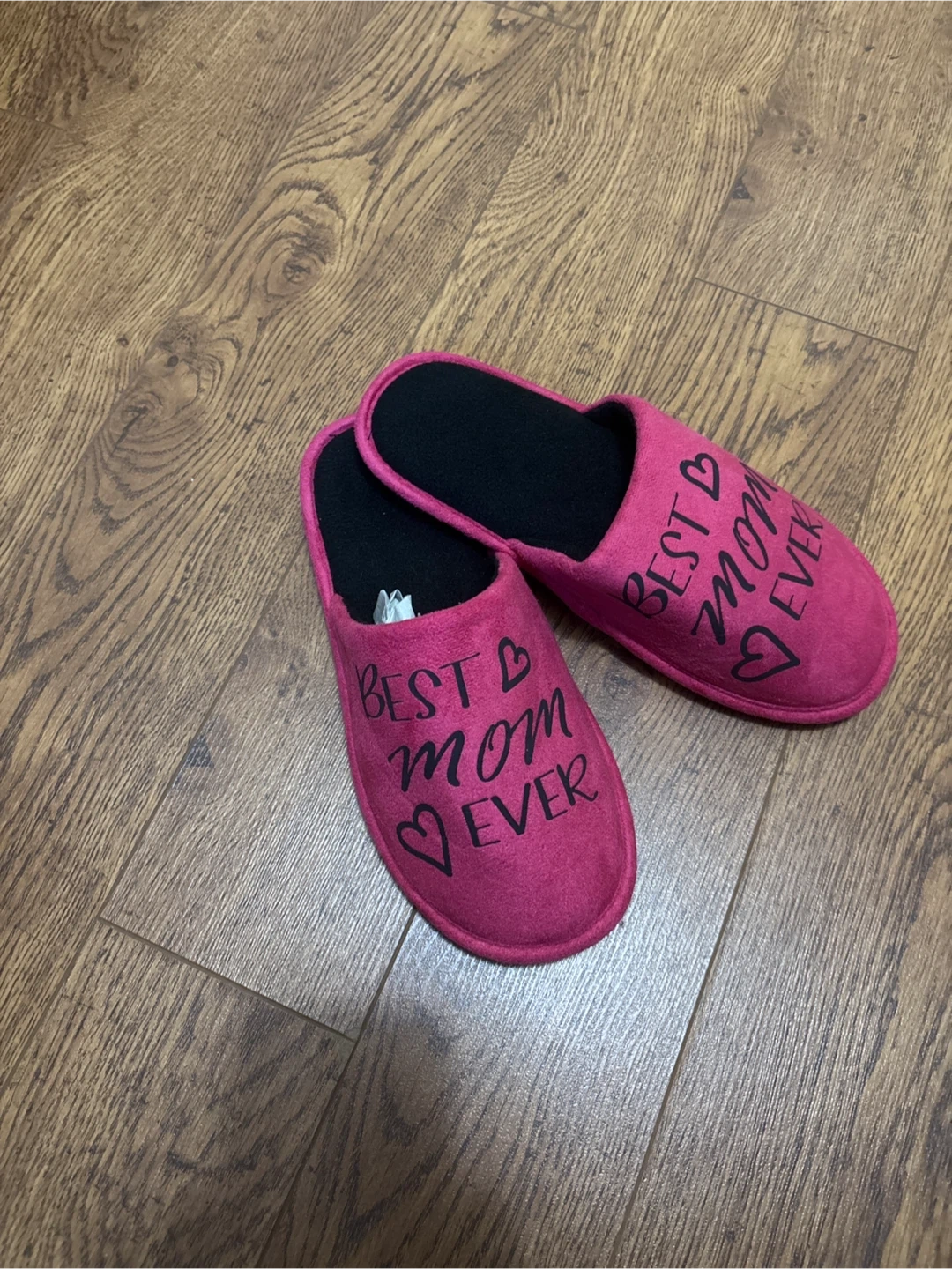 123Cozy pink slippers with "Best Mom Ever" written on them! They are a size large, which fits sizes 9-10. Perfect for keeping your feet warm and showing off your mom pride