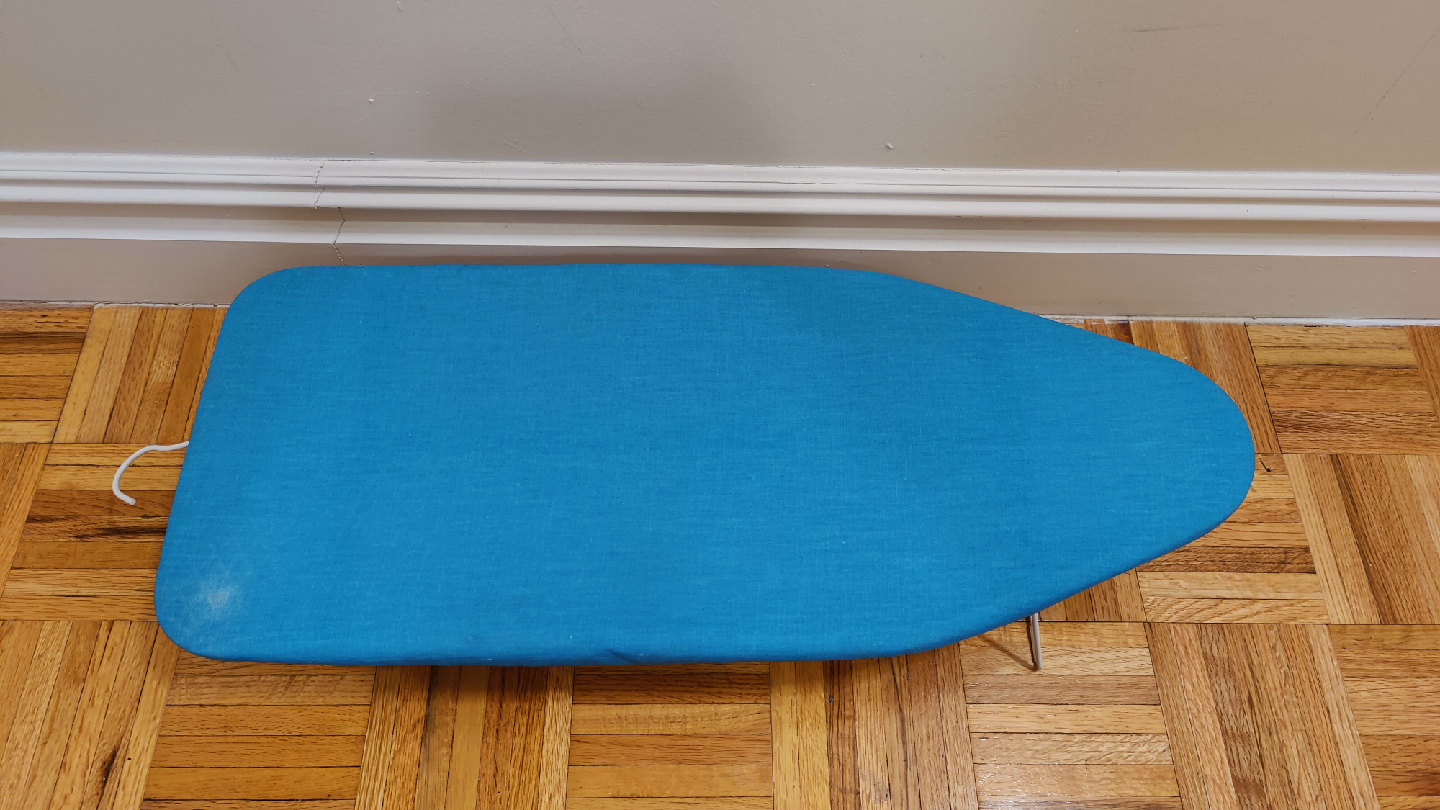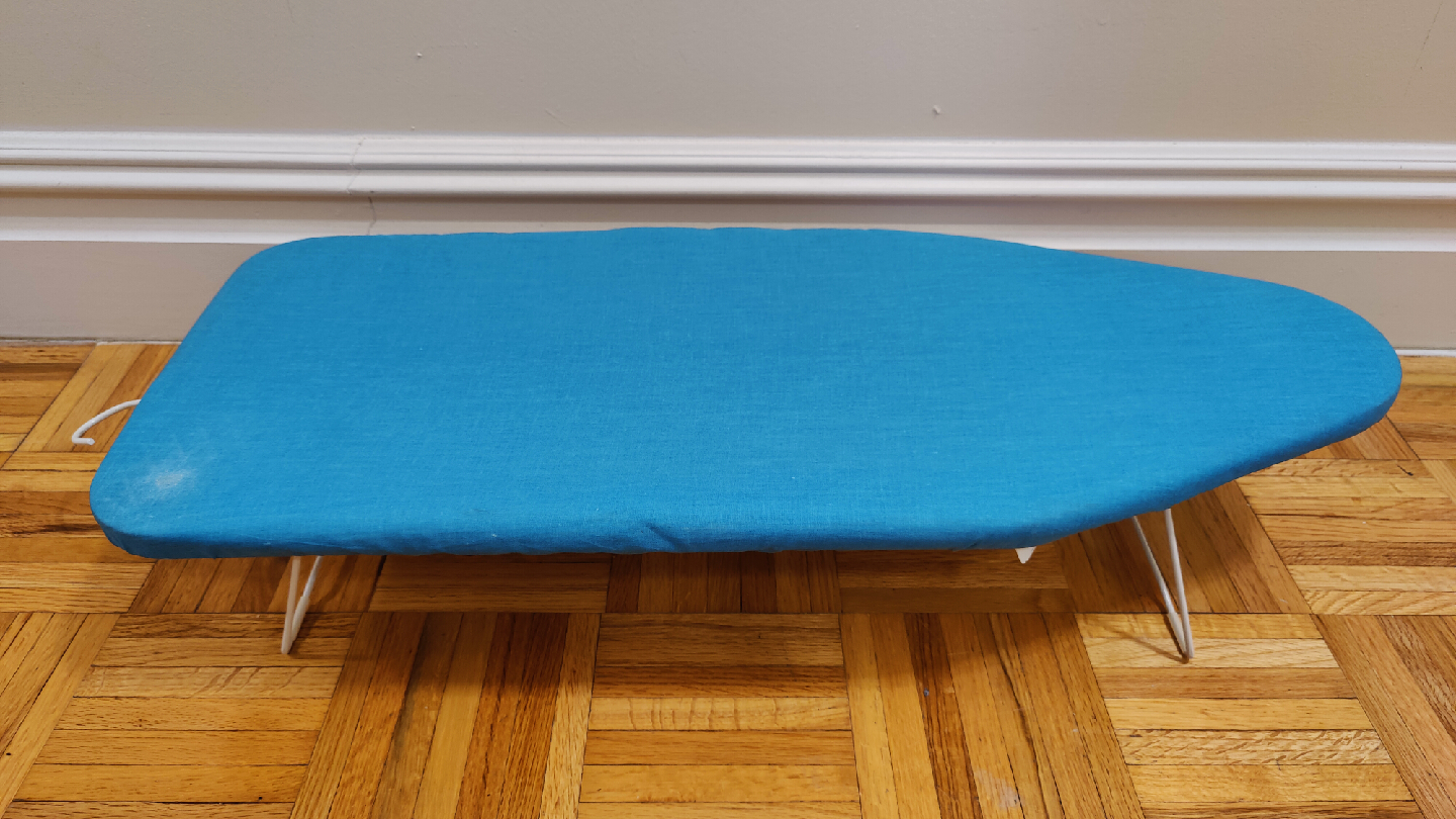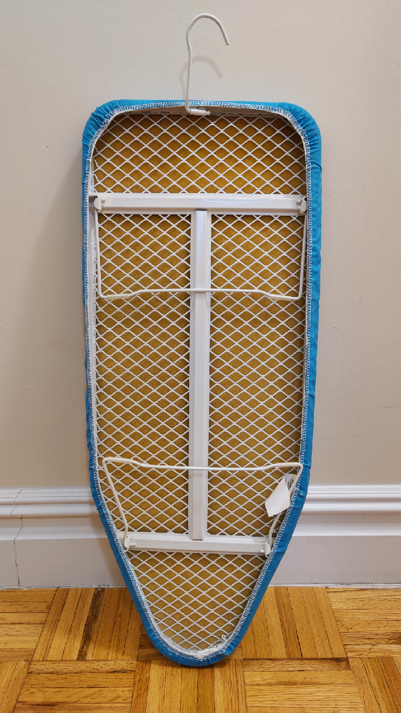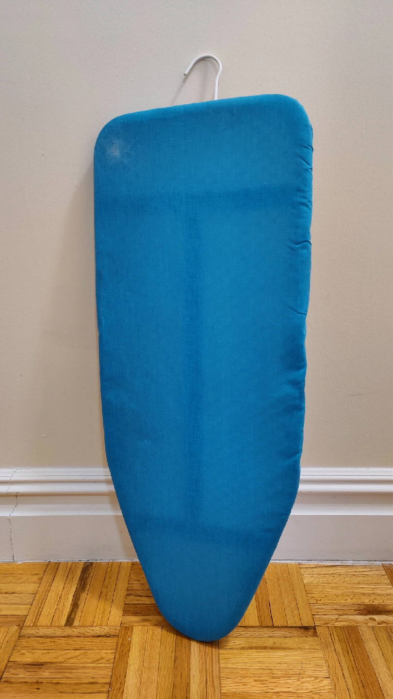 Selling a tabletop ironing board. It is in good condition and perfect for small spaces or quick ironing jobs. The legs fold down when not in use for easy storage behind a door or inside a closet. The cover is a nice blue color.