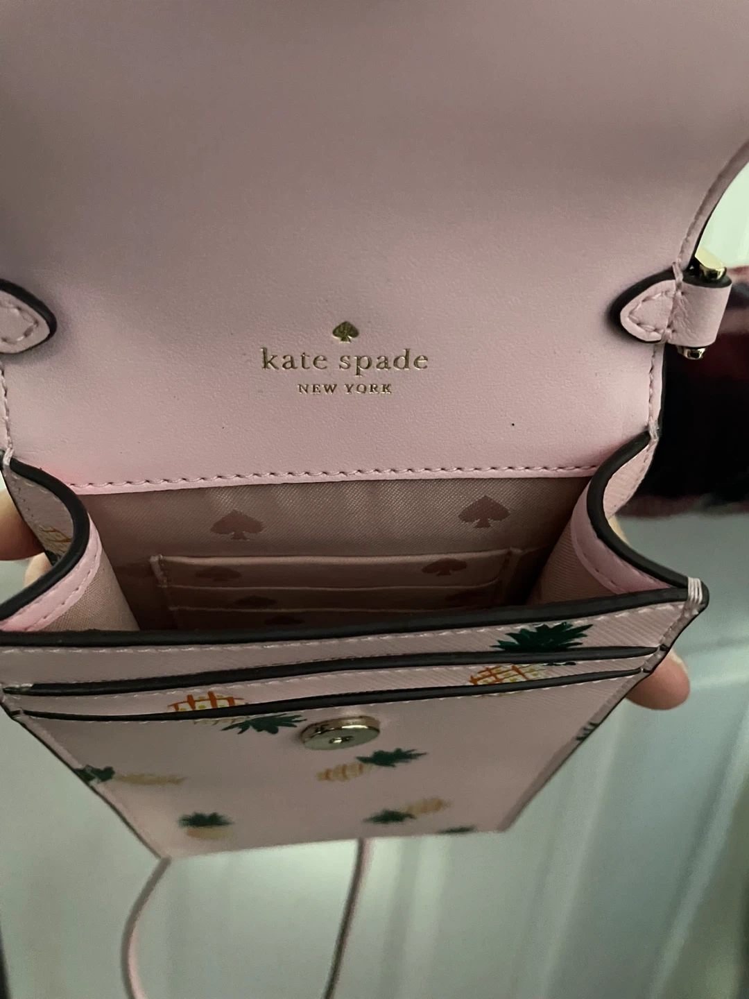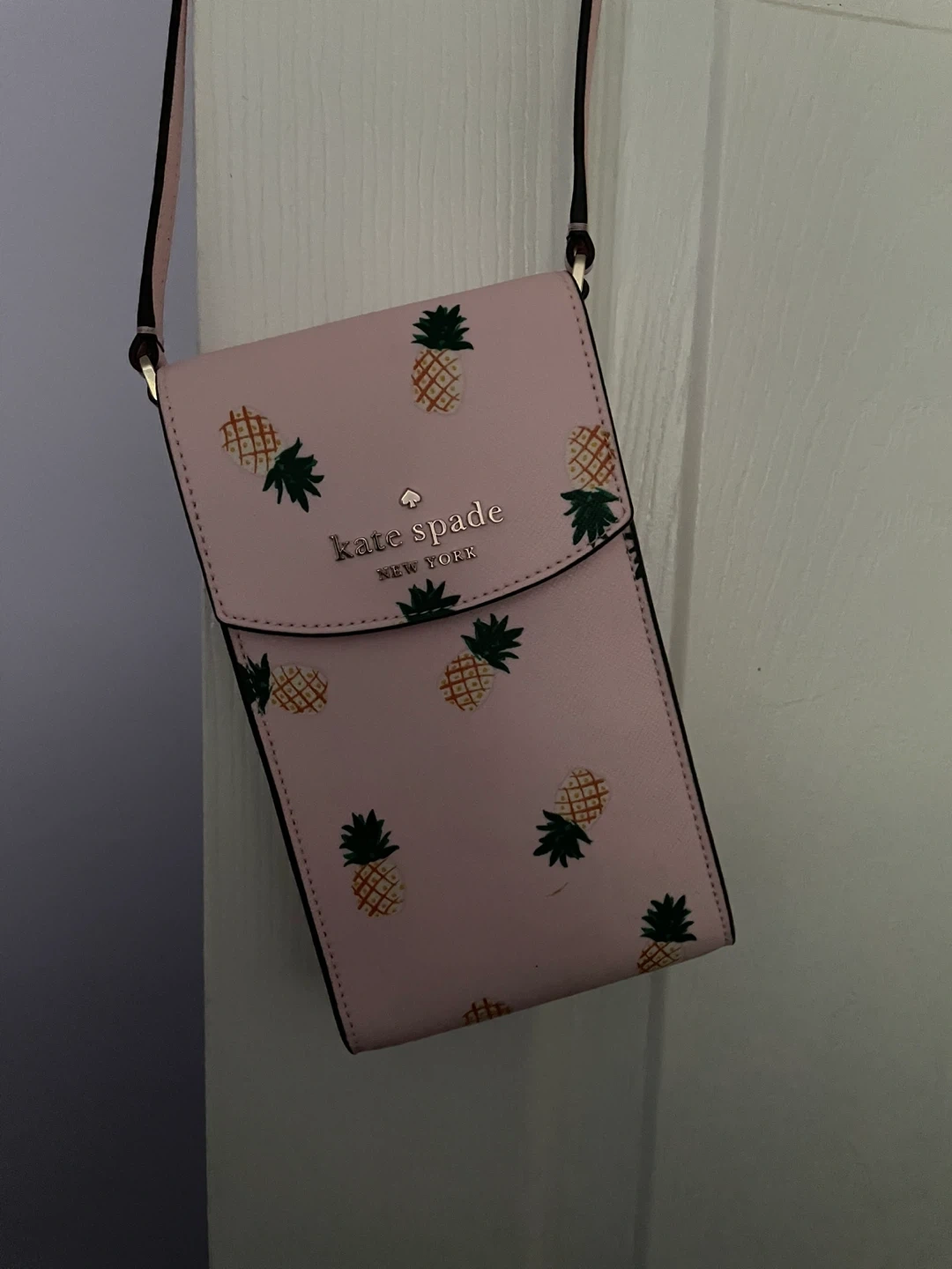 Selling a cute Kate Spade phone crossbody bag! It's a light pink colour and has a fun pineapple pattern. Perfect for carrying your phone and a few essentials when you're on the go!