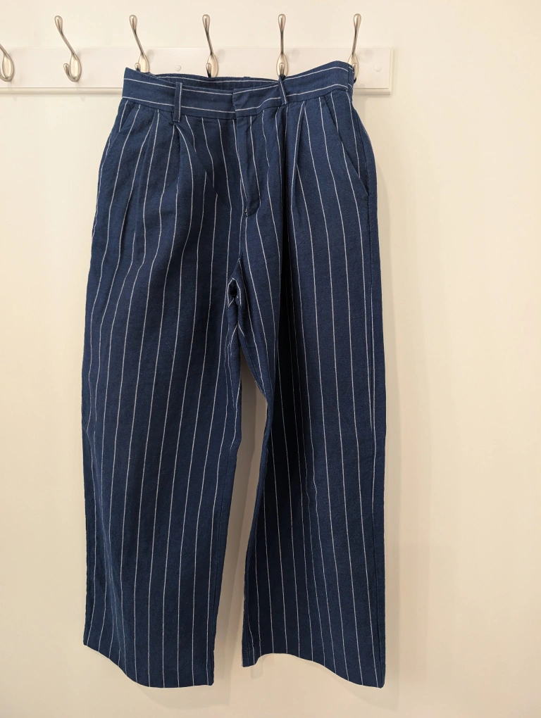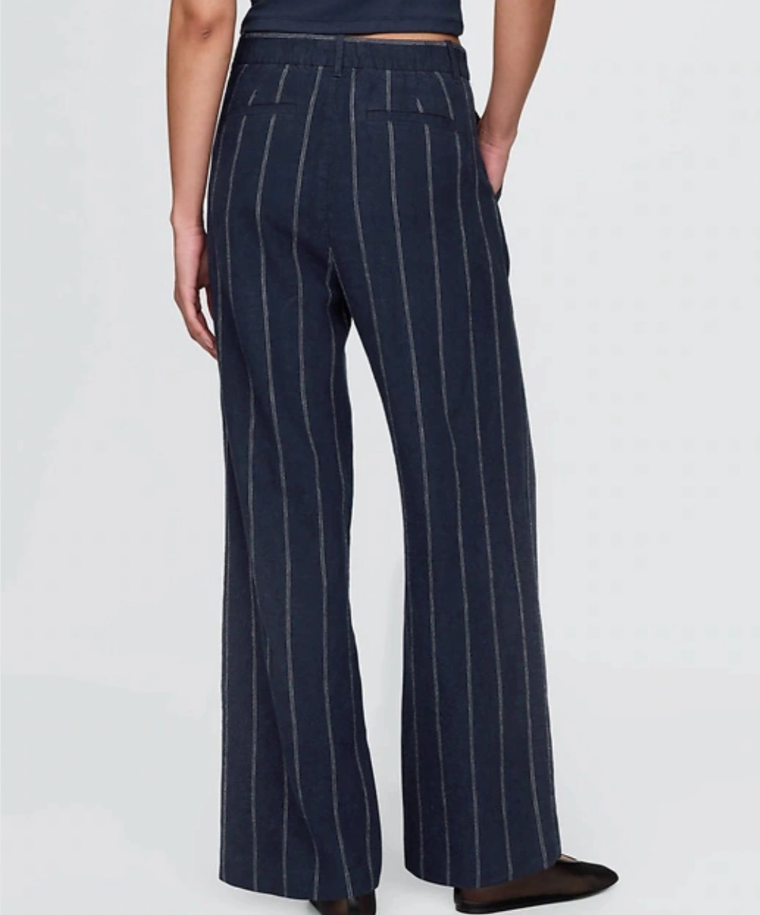 Selling a pair of GAP striped wide-leg trousers in linen blend. They're comfortable and stylish navy blue with subtle pinstripes. These trousers are perfect for a sophisticated and comfortable look. Like new!