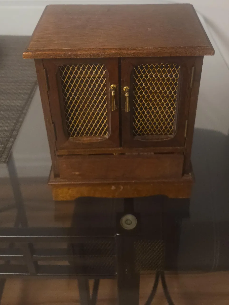 Here's a cute wooden jewelry box! It has little doors that open up, and a few drawers for storing your precious items. Perfect for keeping your jewelry organized and adding a touch of vintage charm to your space