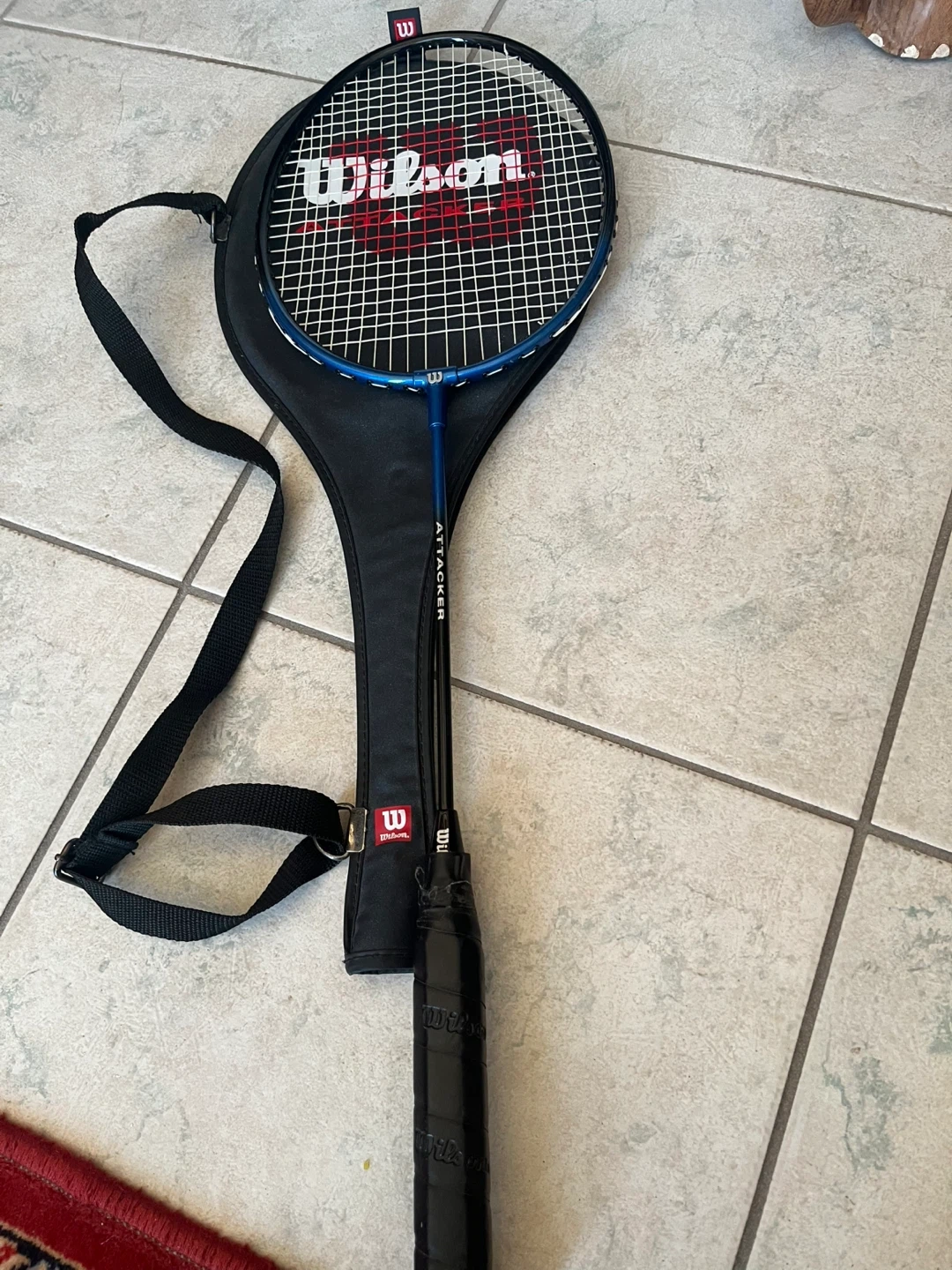 Selling a Wilson Attacker badminton racket. It comes with its original case, perfect for keeping it protected when you're not playing! The grip shows some wear, but it's still ready for a game.