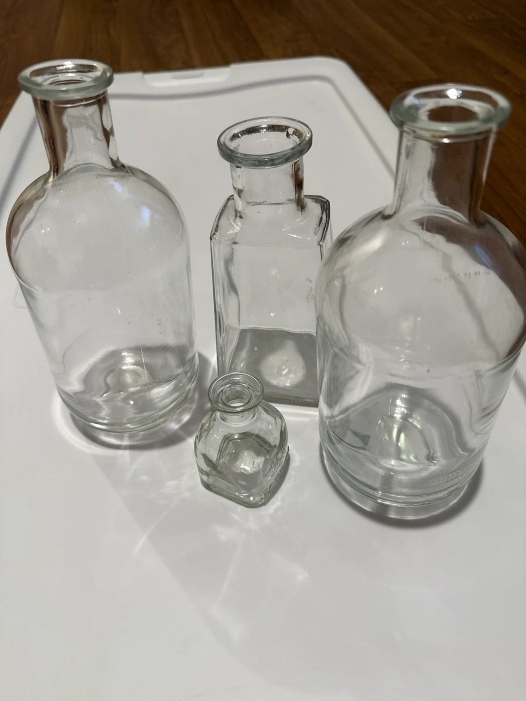 I'm selling a set of four clear glass vases. They come in various shapes and sizes, perfect for displaying flowers or adding a decorative touch to your home. They are in great condition and ready for a new home!