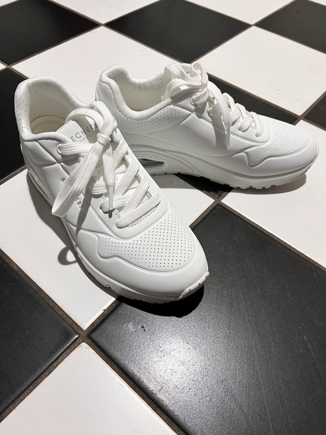Selling a pair of Skechers women's Uno Stand On Air sneakers in white, size 7.5 US. They feature an air-cooled memory foam insole for extra comfort. Retails for $70+