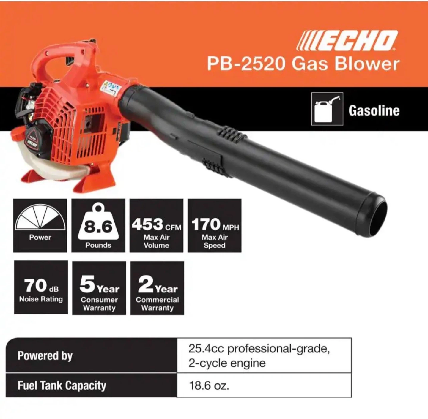 I'm selling an ECHO PB-2520 Gas Blower. It's a handheld leaf blower with a 25.4 cc 2-stroke engine. It has a maximum air volume of 453 CFM and a maximum air speed of 170 MPH. It weighs 8.6 pounds and has a noise rating of 70 dB.