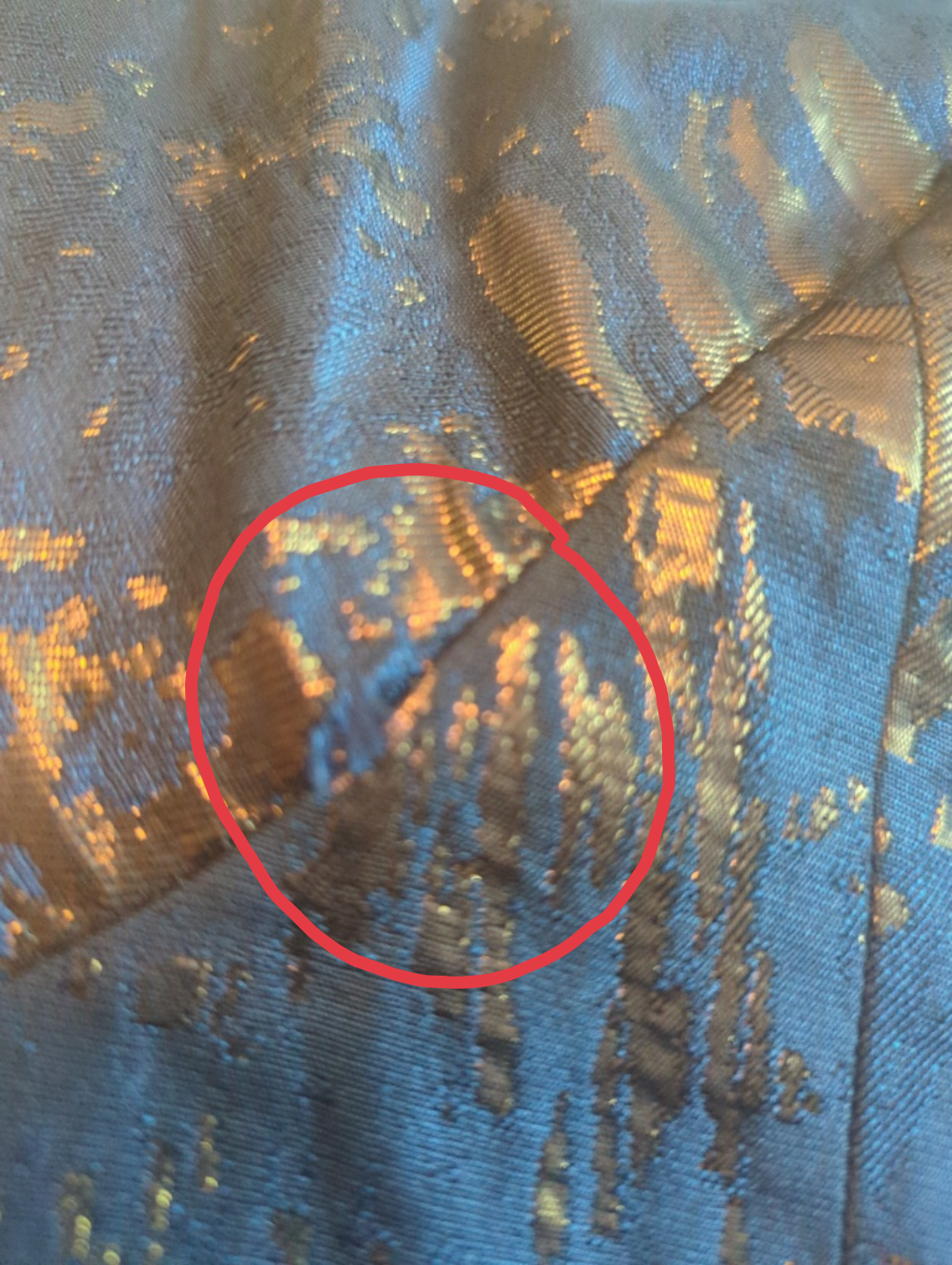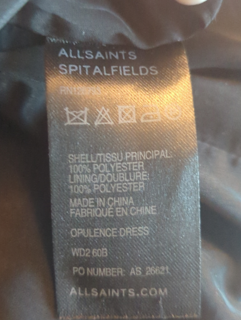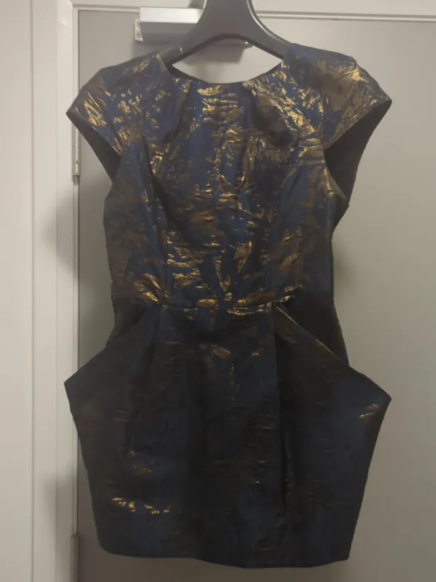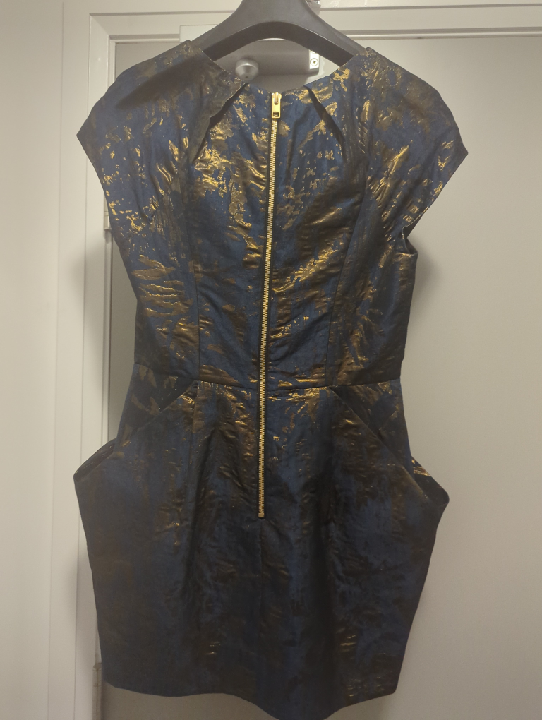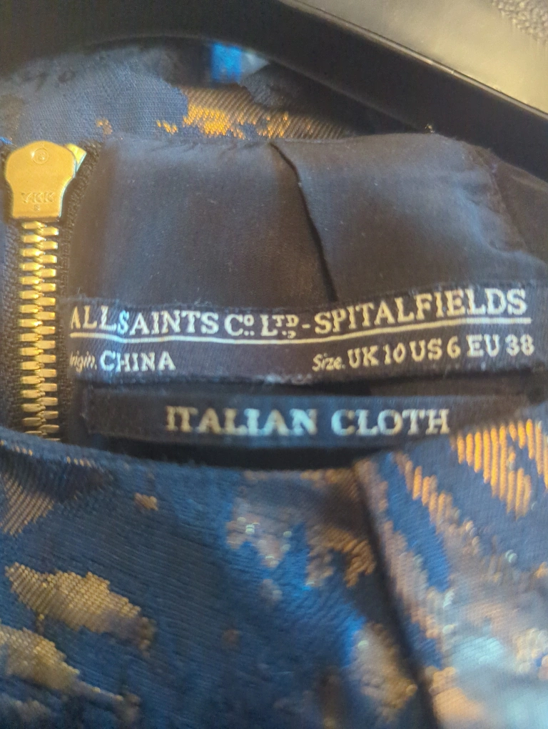 Selling an AllSaints Opulence dress in size 6. The dress is made of 100% polyester for both the shell and lining. It features a unique navy and gold pattern. There is a small flaw (as shown in the last picture, easy to fix). Fabric doesn't stretch. Dry cleaned.
