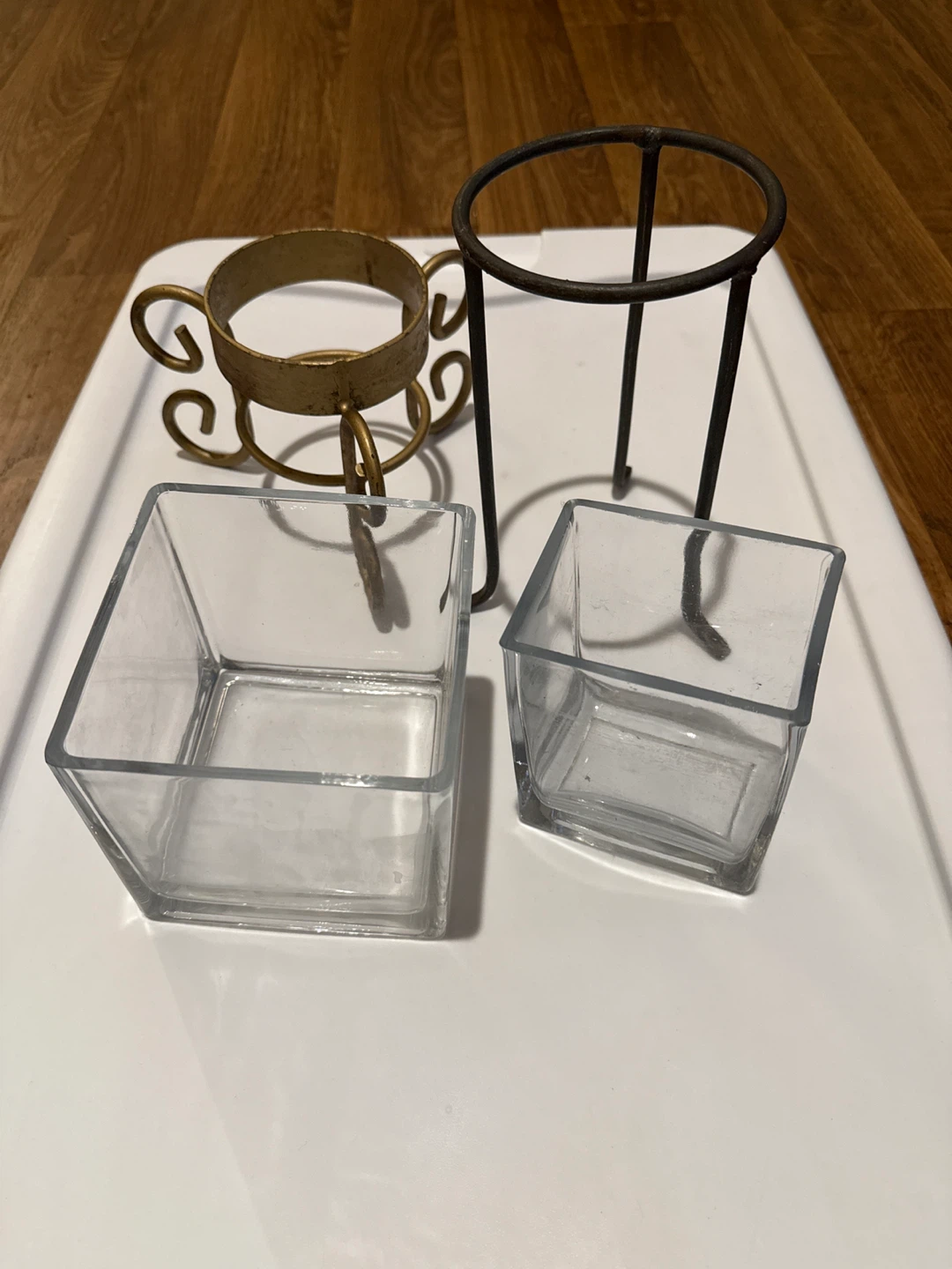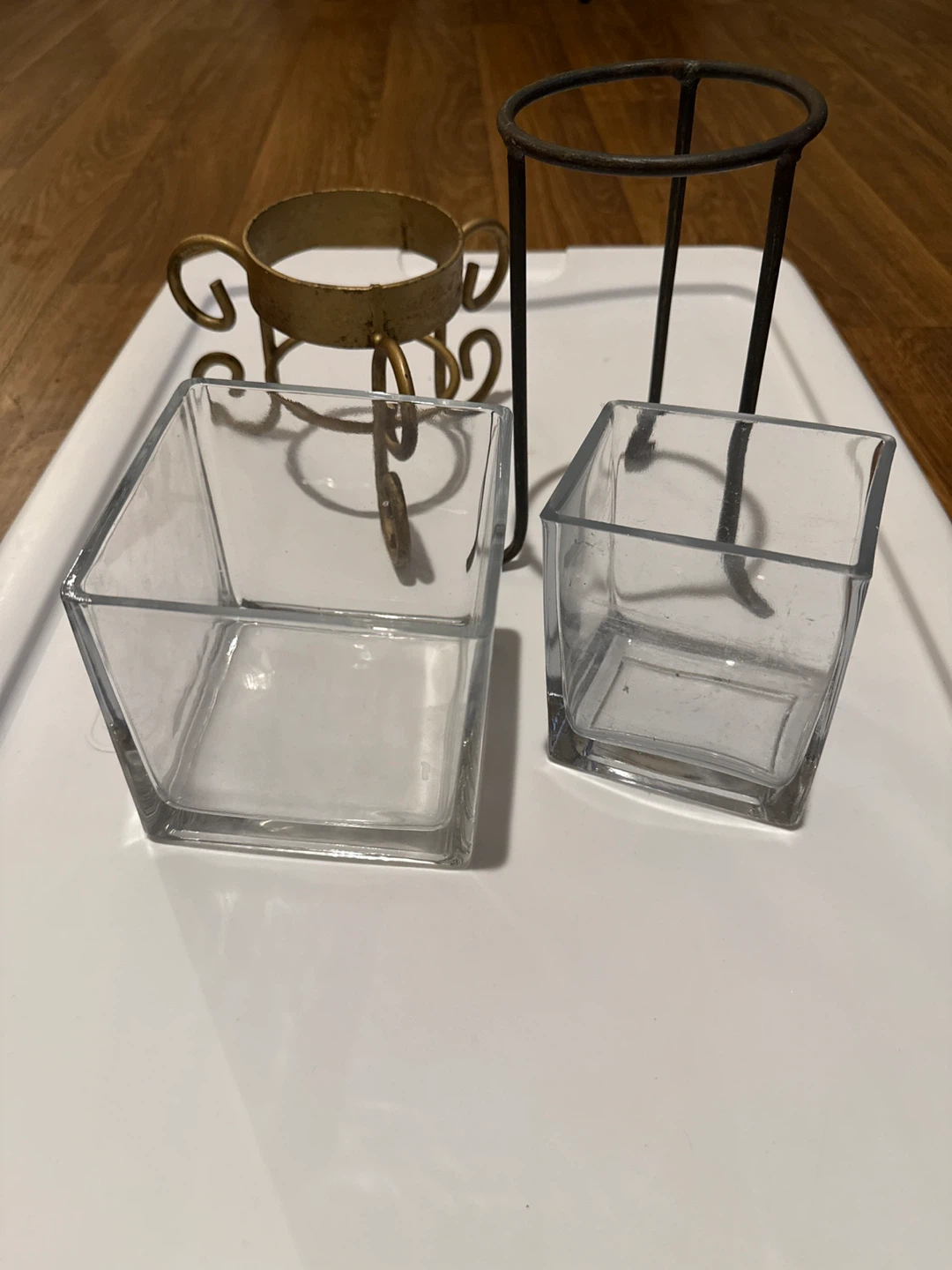 Selling a set of glass square vases and metal candle holders. They're in good condition and would be perfect for adding a touch of elegance to your home decor