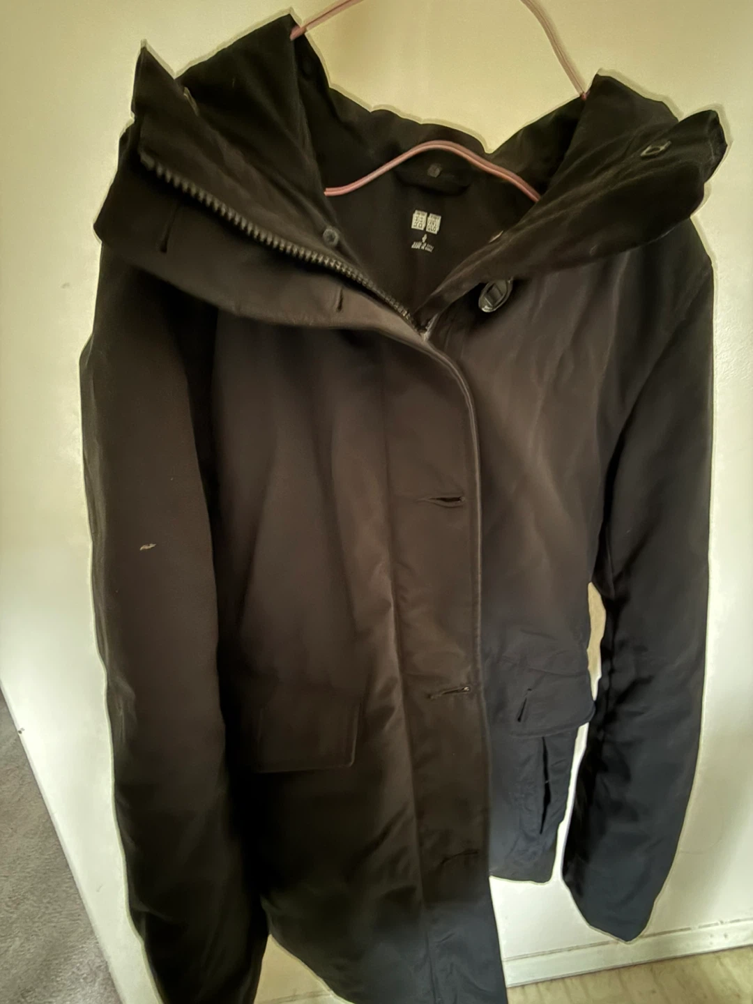 Selling a gently used Uniqlo black down jacket in size small. It's in great condition and perfect for the colder weather! This jacket features a zipper and button closure, and a hood for extra warmth.