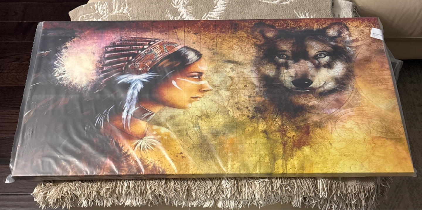 SEALED Design Art canvas wall art, still in its original packaging. This piece features a beautiful design of a Native American woman and a wolf, perfect for adding a unique touch to your home decor!