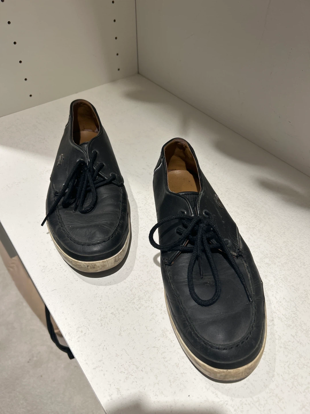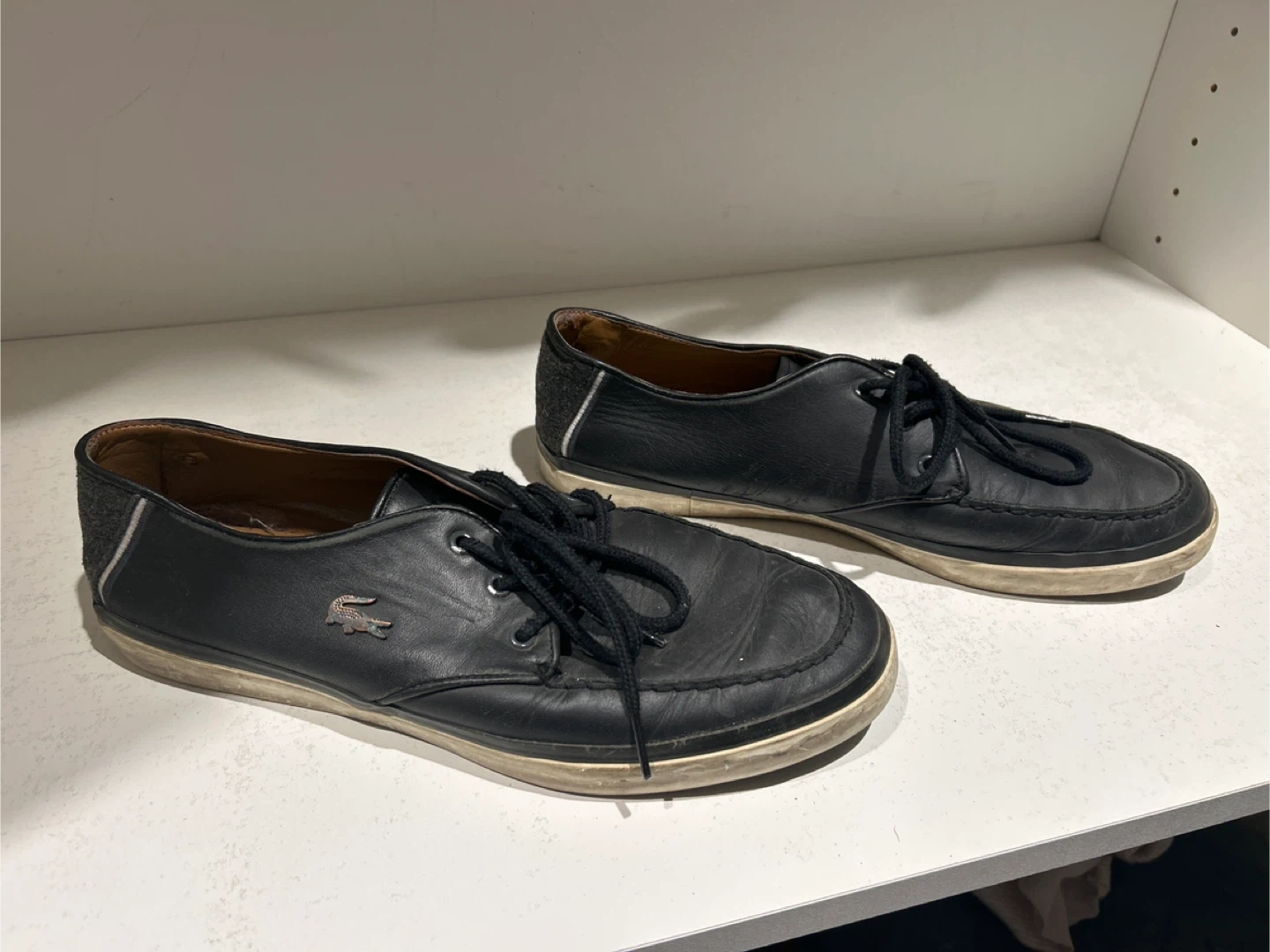 Selling a pair of Lacoste black leather shoes in size 11. They are in used condition, as shown in the photos. A stylish and comfortable shoe for everyday wear!
