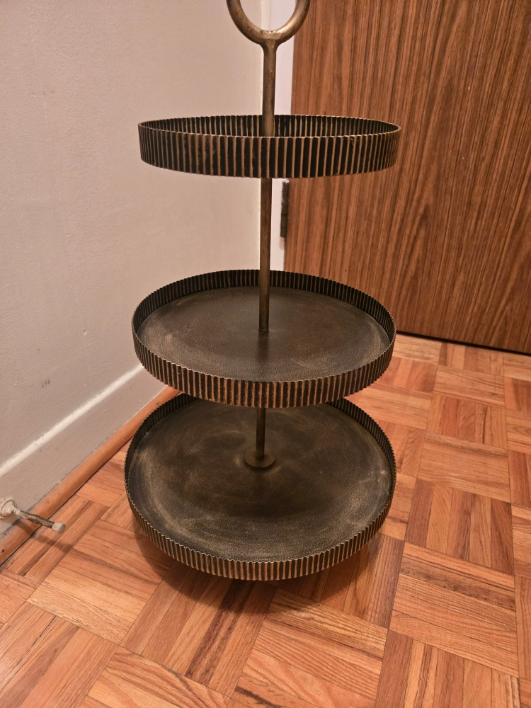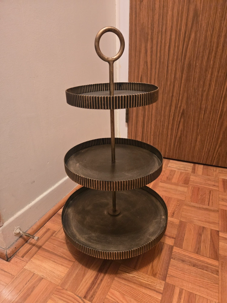 Selling a stylish 3-tiered metal serving stand. It's perfect for displaying desserts, appetizers, or even as a decorative piece! The stand has a rustic, antique gold finish that adds a touch of elegance to any setting. It's in MINT condition!