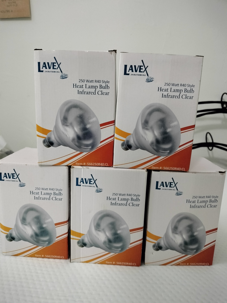 Selling 5 LAVEX 250 Watt R40 Style Heat Lamp Bulbs in Infrared Clear. They are new in the box.