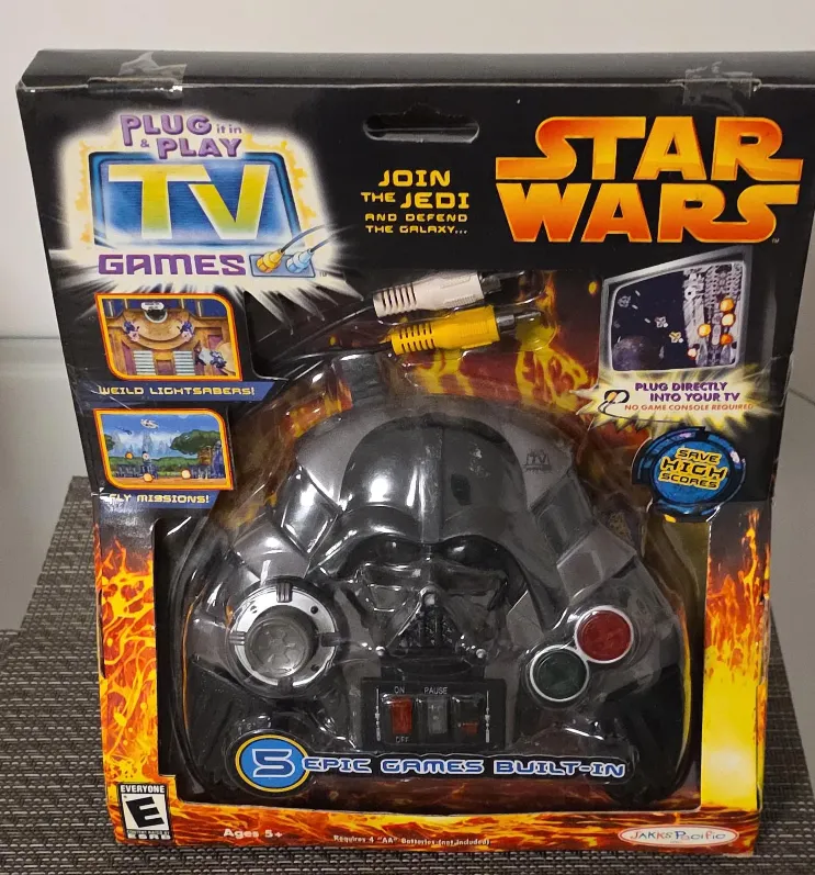 Join the Jedi and defend the galaxy with this Star Wars Plug & Play TV Game! It's a Darth Vader-themed controller with 5 epic games built-in. Just plug it directly into your TV, no game console required. Save high scores and wield lightsabers on your missions. Perfect for ages 5+