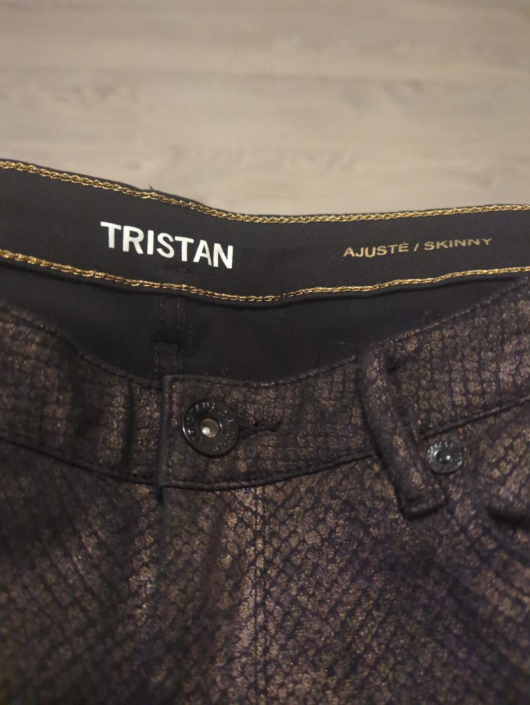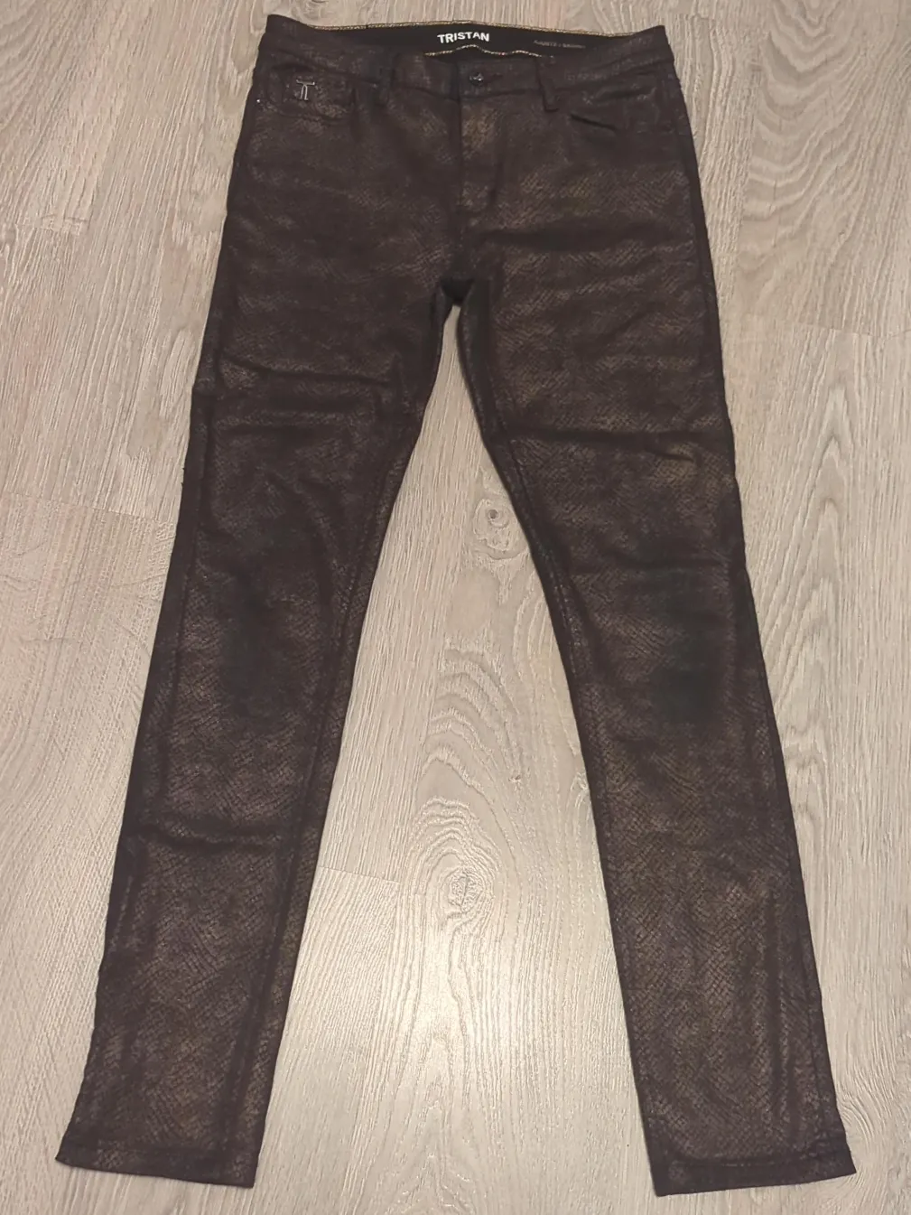 Selling a pair of Tristan jeans in a skinny fit style. Dark brown snake print. The material is 98% cotton and 2% spandex which makes this pair very stretchy. Worn once. Impeccable condition. The care instructions are: