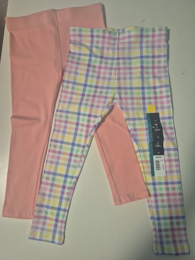Selling a brand new 2-pack of girl's leggings in size 5T! One pair is solid light pink, and the other is a colourful plaid pattern. Perfect for your little one!