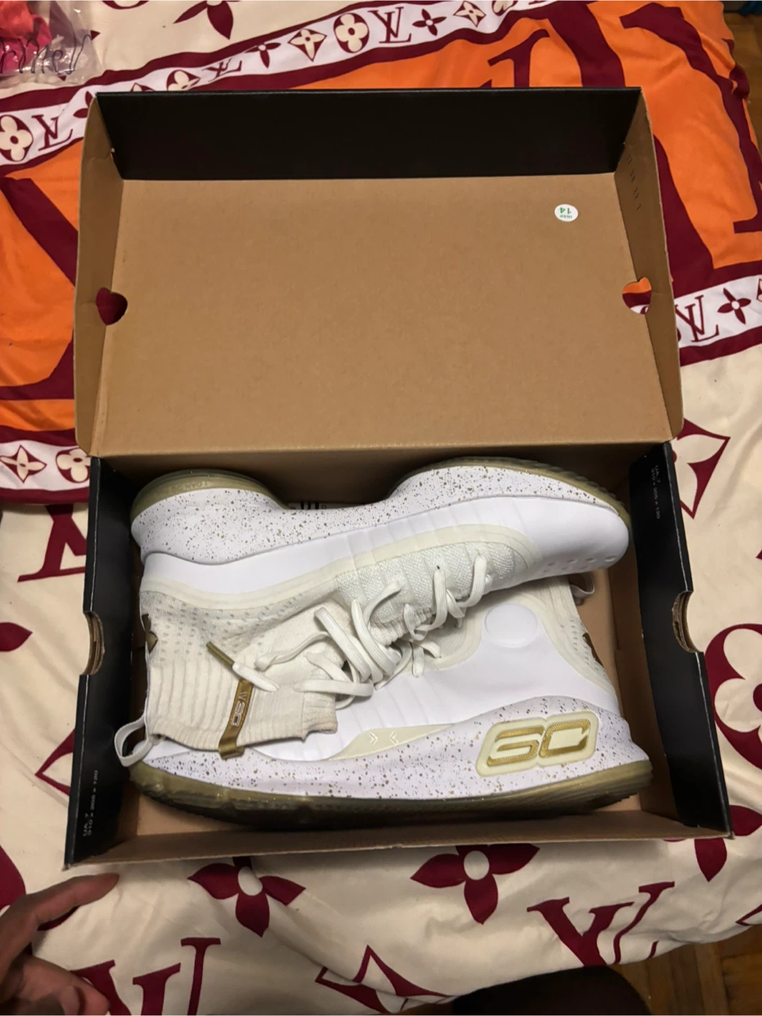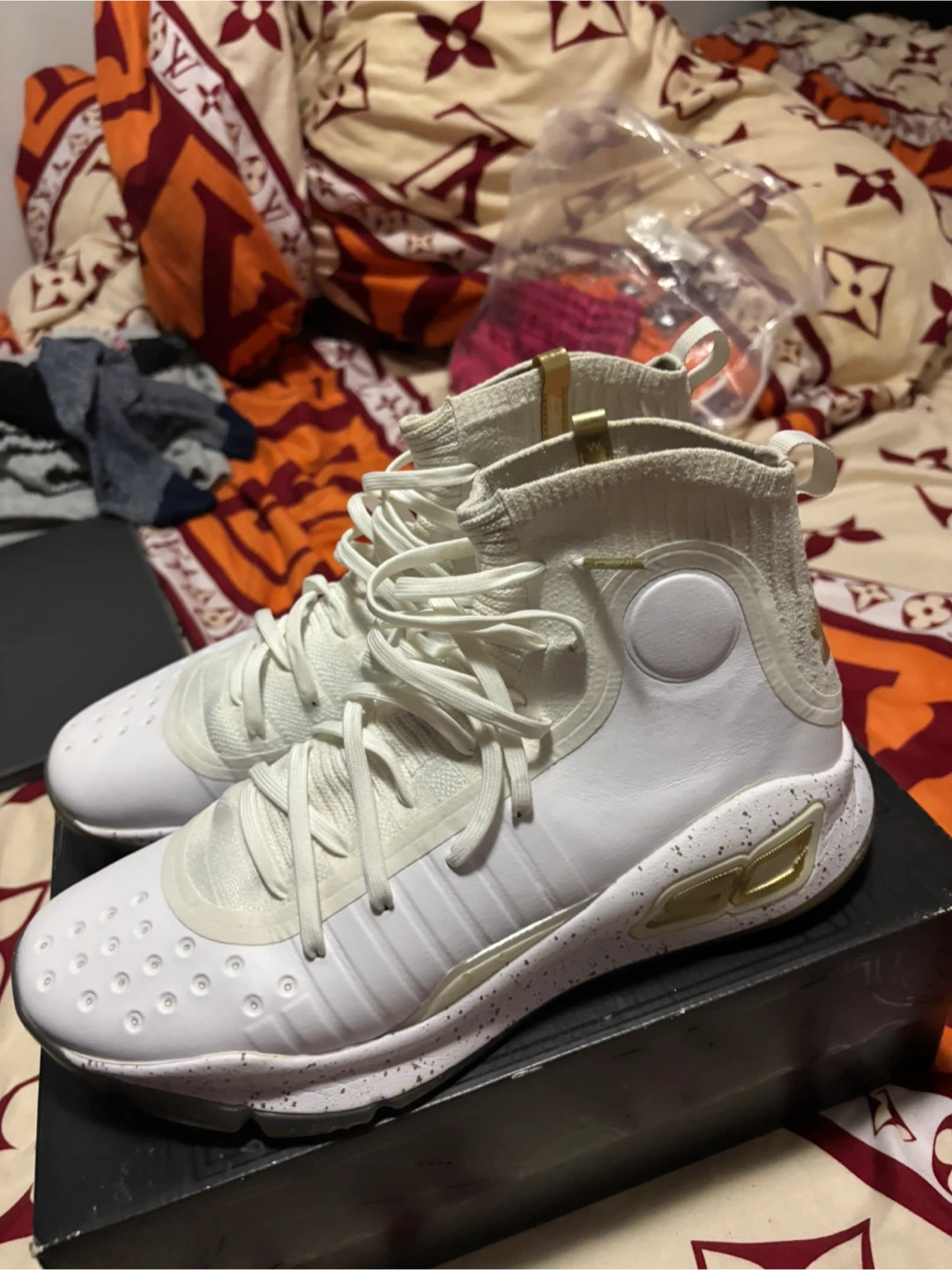 Selling a pair of Under Armour Curry 4 shoes in size 8. They come in the original box. The colour is white with gold accents. These retail for $159.99
