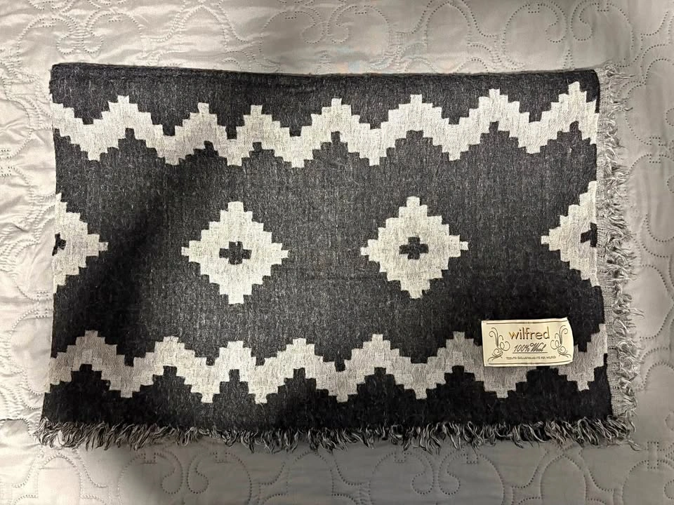 Reversible Dimensions: 51" wide x 63" long Origin: Yarn from Australia Material: 100% wool Care: Dry clean Imported Retails for $88+tax Colour: Black Can be worn as a wrap, scarf, or blanket Scarf has been worn a few times, but is in like new condition Willing to negotiate within reason Willing to send more photos/videos upon request