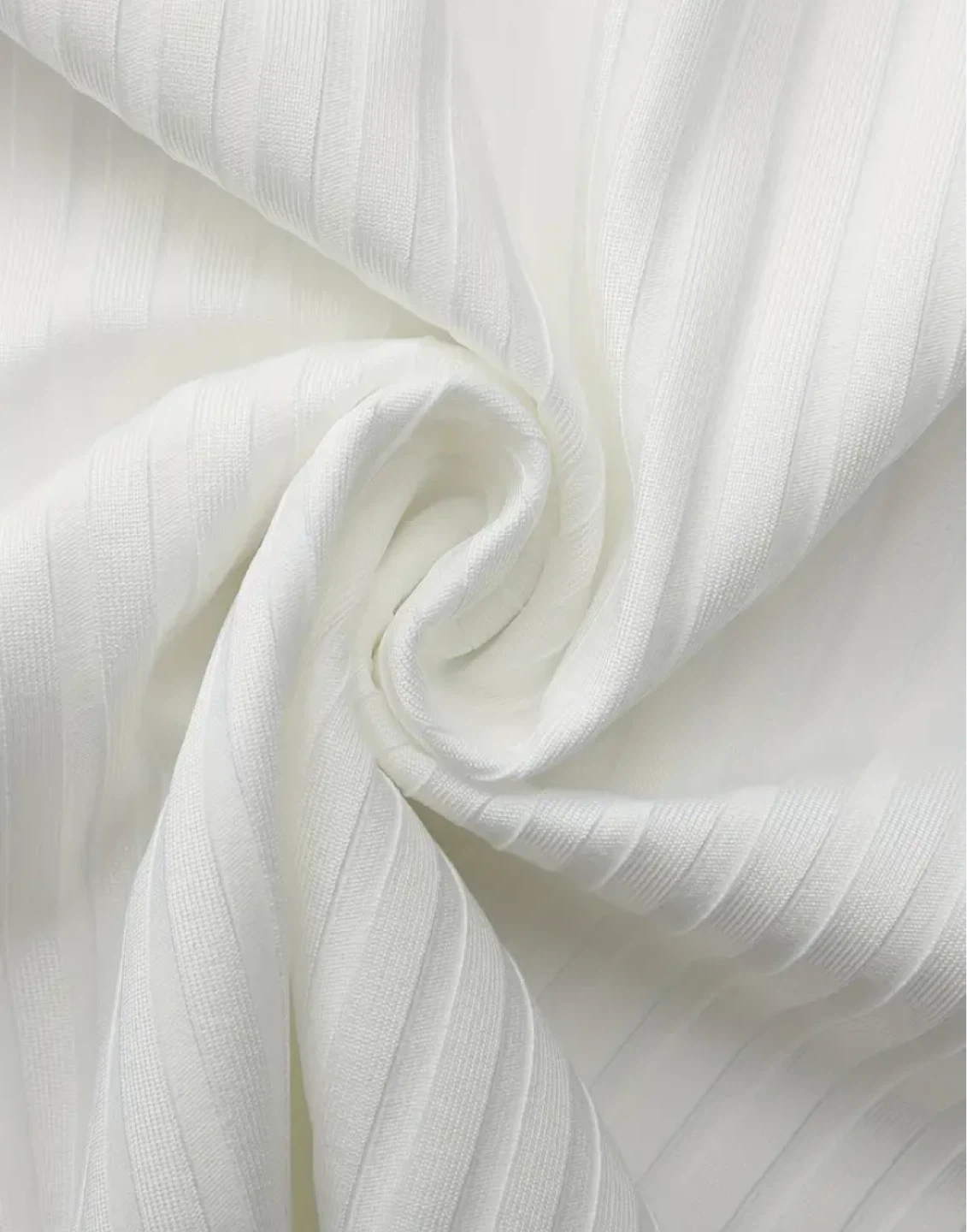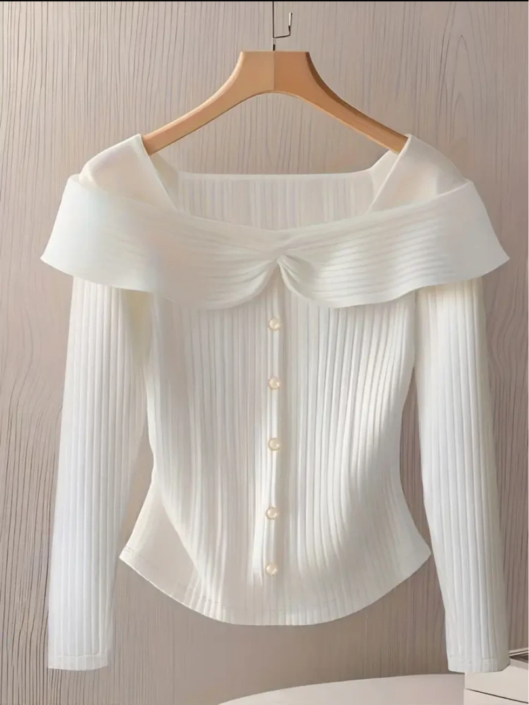 Here's a lovely white long sleeve blouse! The material has a ribbed texture and features a unique neckline. It's in great condition and ready for a new home