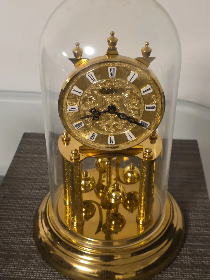 Selling a beautiful Jahresuhr anniversary clock, complete with its elegant glass dome. The clock features a stunning gold finish and intricate detailing. It would make a lovely addition to any home!