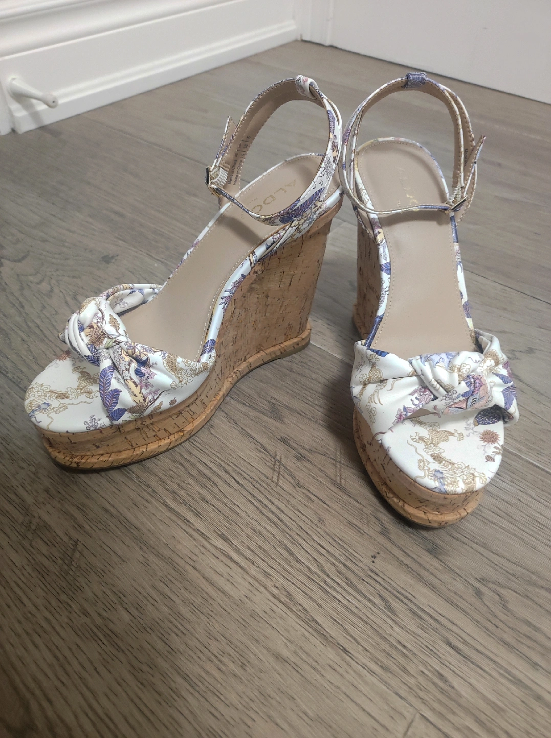 147Cute Aldo wedge sandals in a size 7. These feature a floral pattern on a white base with a cork wedge heel. Perfect for adding a touch of style to your summer outfits!