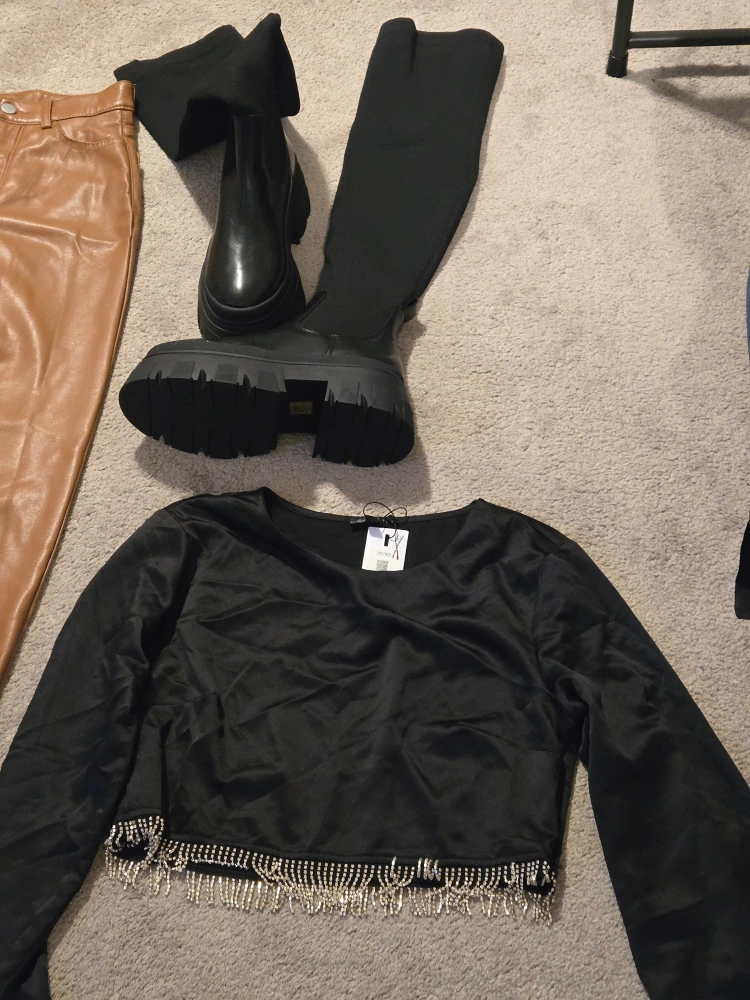 Selling a cute black crop top! It features long sleeves and a stylish rhinestone fringe along the bottom. Perfect for a night out or dressing up any outfit!