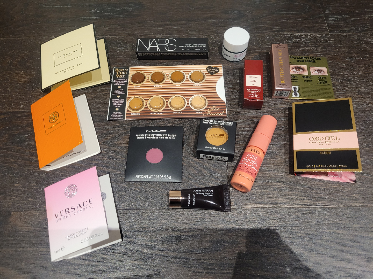 Makeup bundle that includes one full size (Mac powder kiss soft matte eye shadow) and 5 travel perfumes (Jo Malone: Wood Sage and Sea Salt; Tom Ford: Lost Cherry; Tory Burch: Knock on Wood; Versace: Bright Crystal; and Good Girl Carolina Herrera. Travel sized makeup includes Josie Maran whipped argon oil face butter, Aveda leave in conditioner, Mac powder kiss soft matte eye shadow, Too Faced Foundation, Dr. Jart tiger grass colour correcting treatment, Nars velvet matte lip pencil (red colour), and Too Faced better than sex mascara (black).