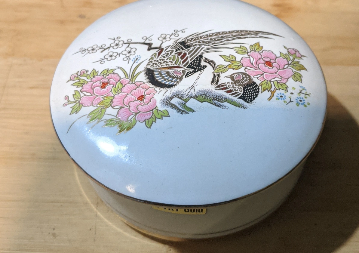 A lovely trinket box with 24KT gold accents! It features a beautiful design of birds and flowers on a light blue background. Perfect for storing small jewelry or keepsakes