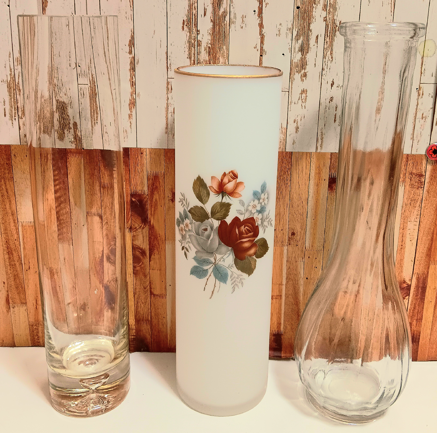 I am selling a set of three decorative glass vases, all in used condition. Each vase has a unique shape and design, perfect for displaying flowers or as standalone decor.