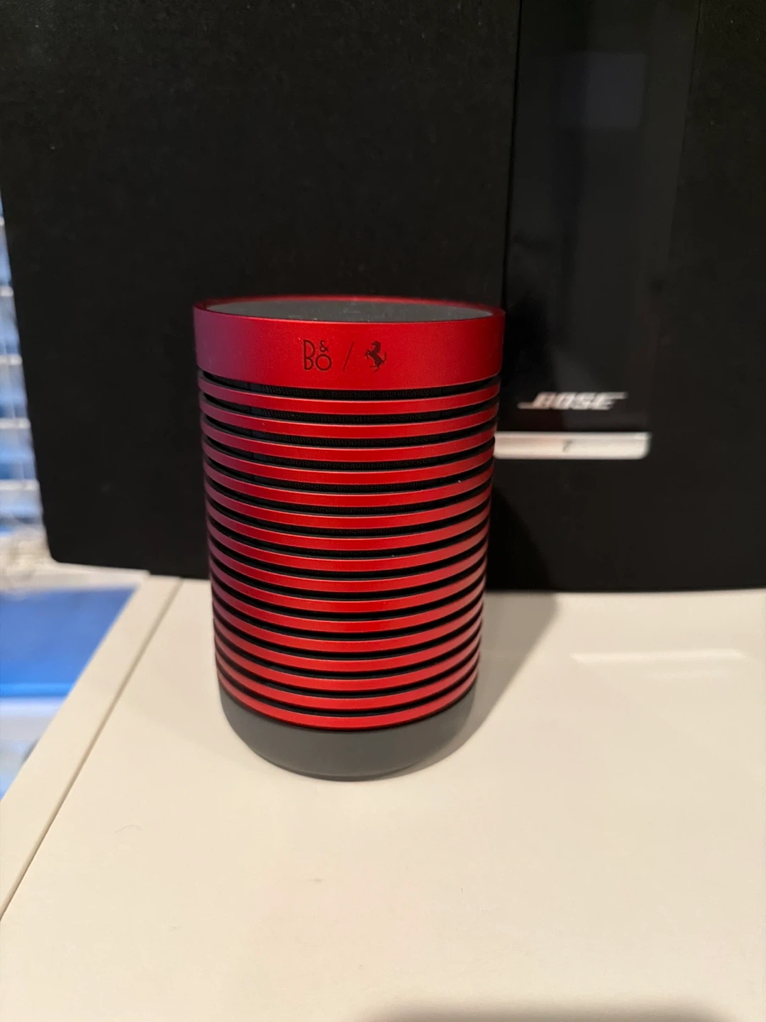 Selling a Bang & Olufsen Beosound Explore portable speaker in the Ferrari edition. It's in great shape and ready for a new home! This speaker is known for its rugged design and excellent sound quality, perfect for both indoor and outdoor use. The red and black design is super stylish!