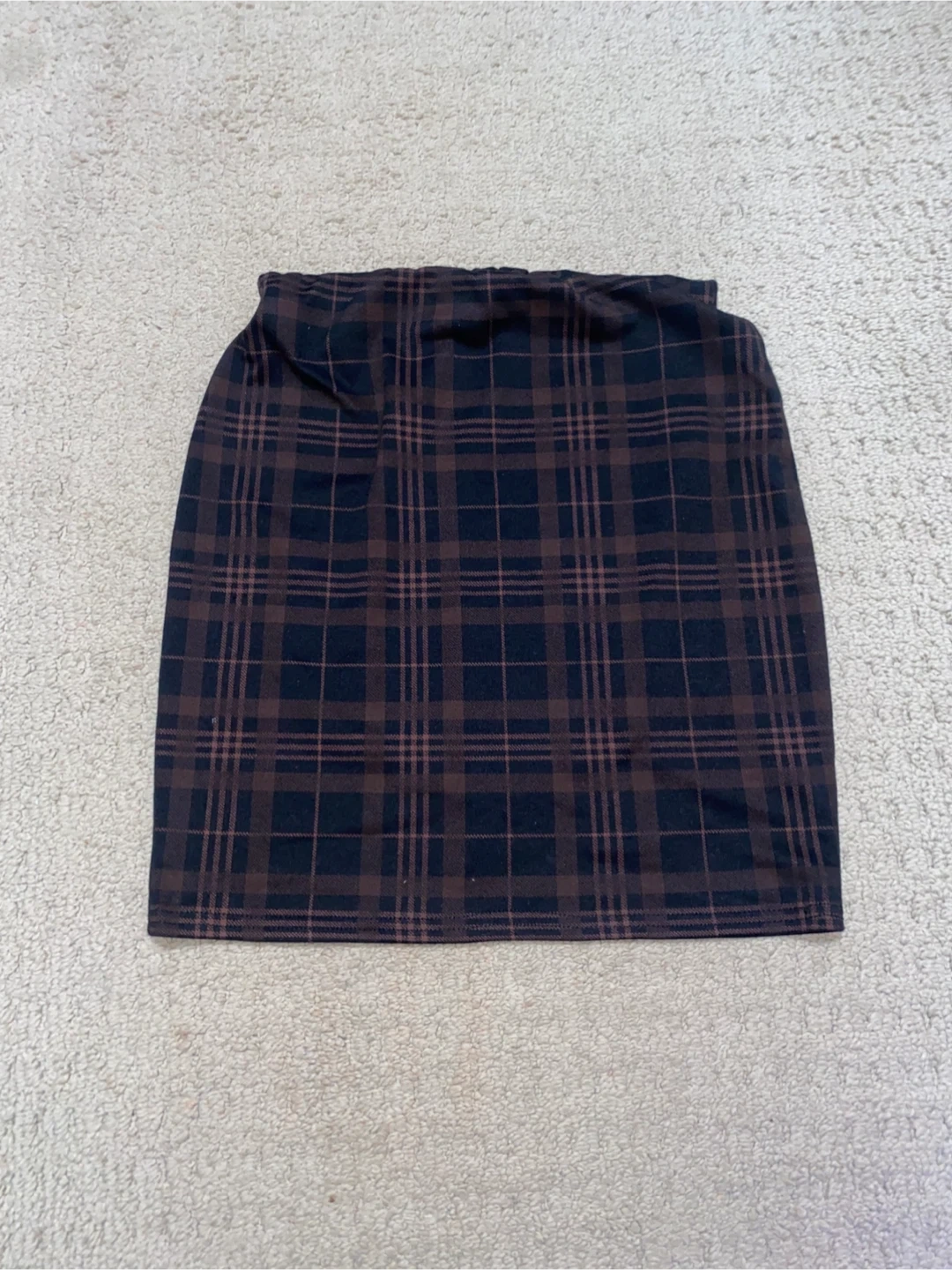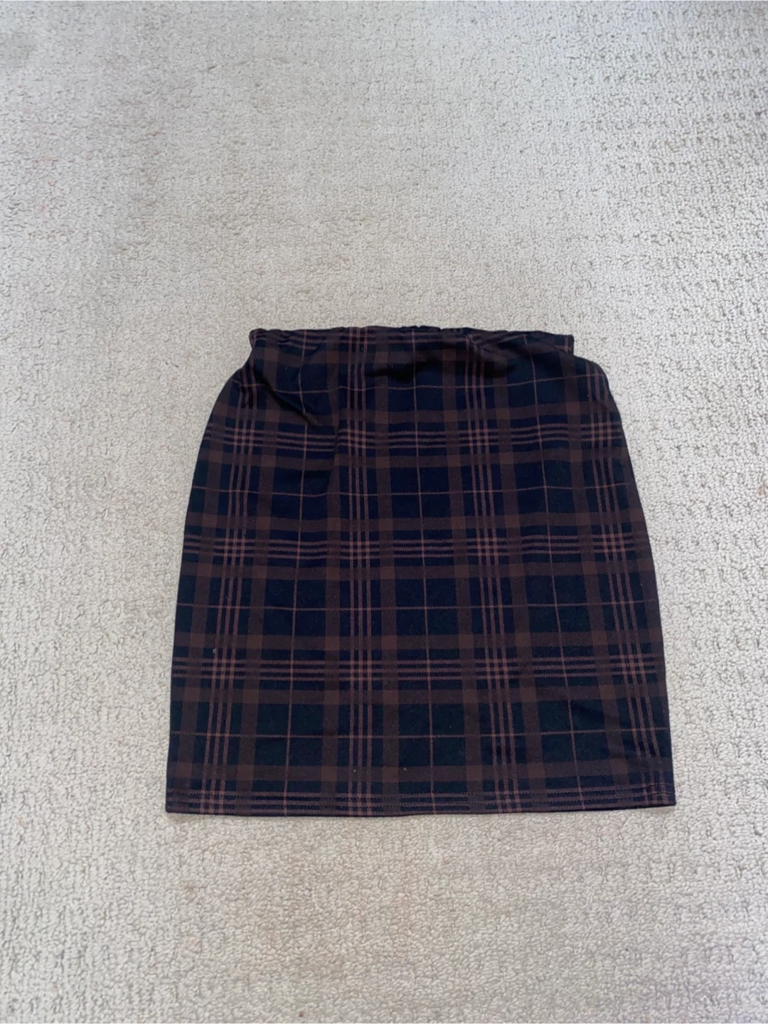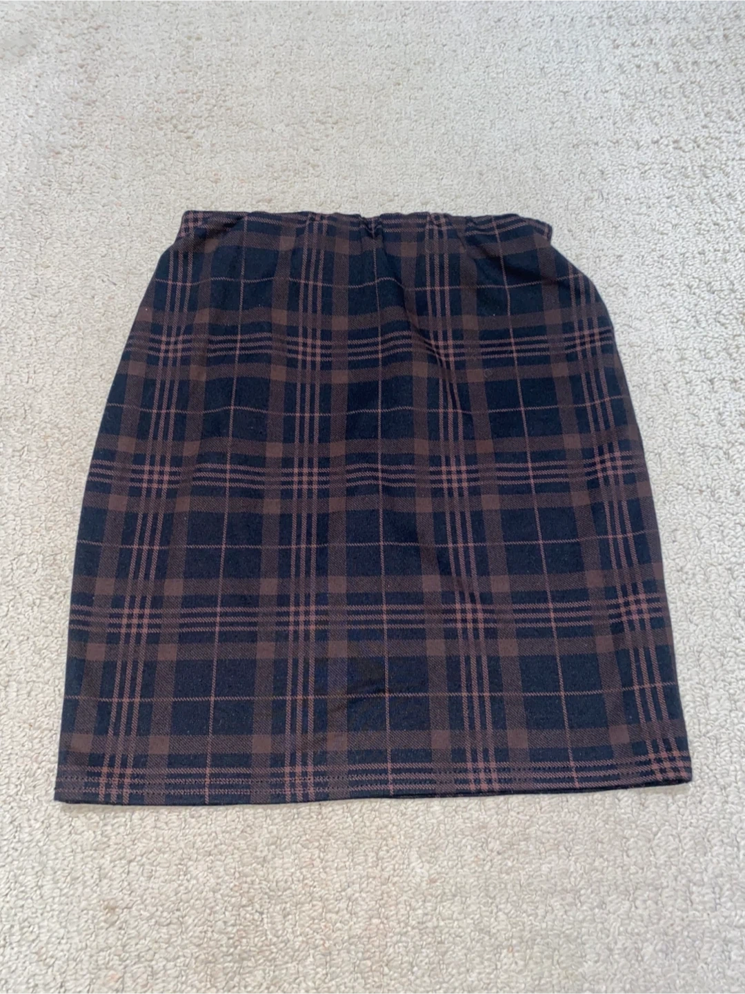 174Here's a brown plaid skirt that's in great condition! It's perfect for adding a touch of classic style to your wardrobe. The plaid pattern is a mix of brown and black, making it easy to pair with different tops and shoes