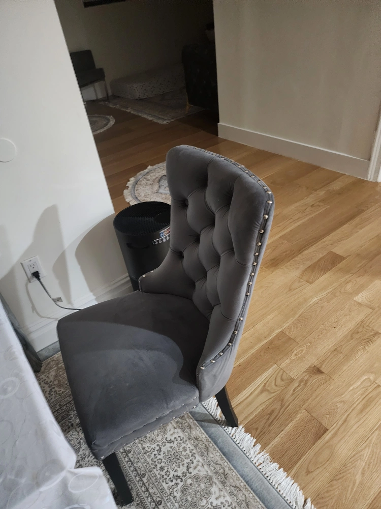Selling a gray tufted dining chair. It's in good condition and would look great in any dining room or as an accent chair. The chair features a tufted back and a comfortable seat. It is a stylish and functional piece of furniture