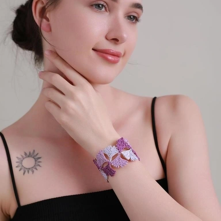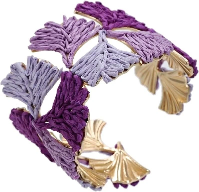 This cuff bracelet showcases a beautifully crafted ginkgo leaf made from raffia, offering a unique and natural aesthetic. The open cuff style ensures a ideal fit for any wrist size.