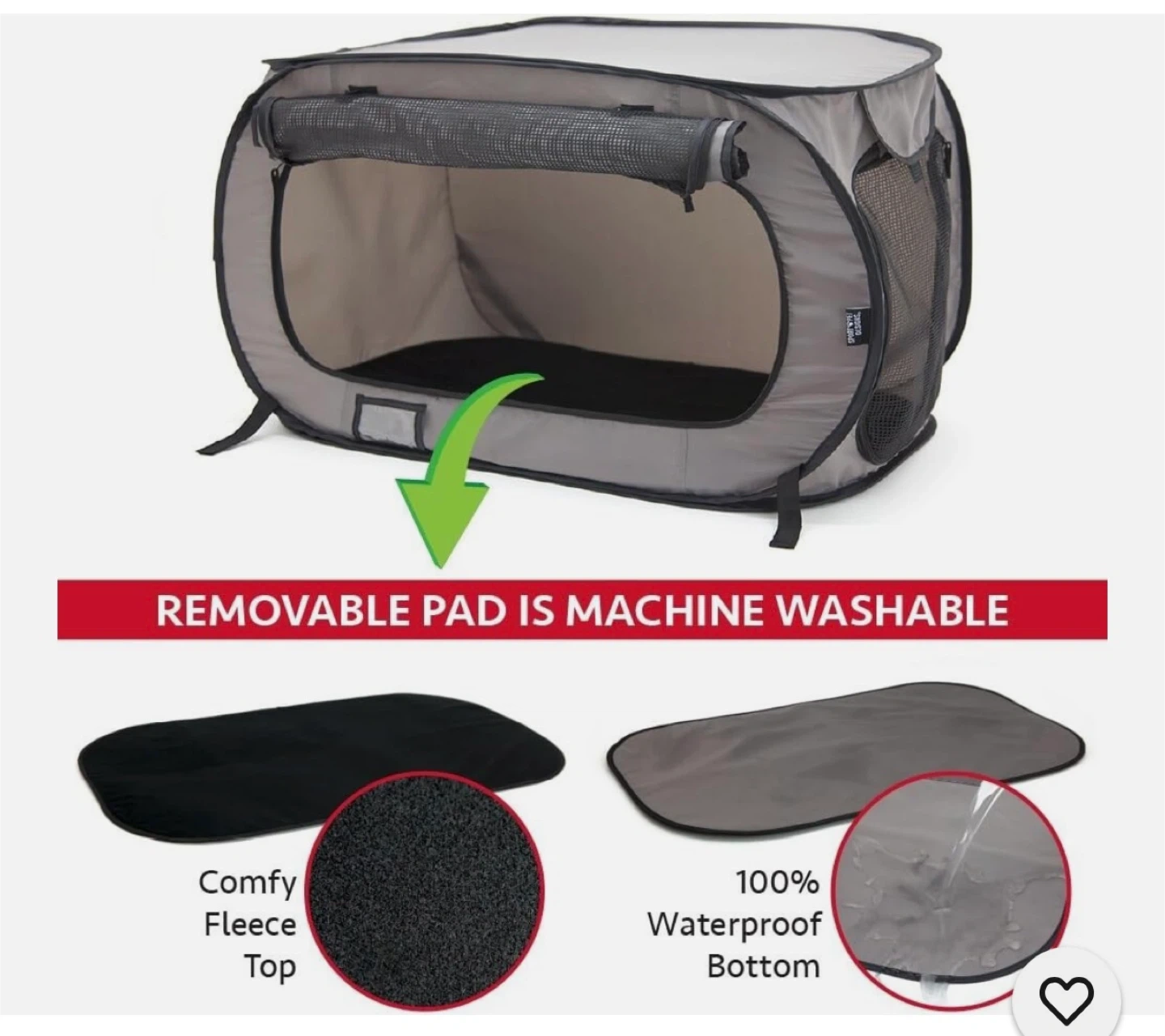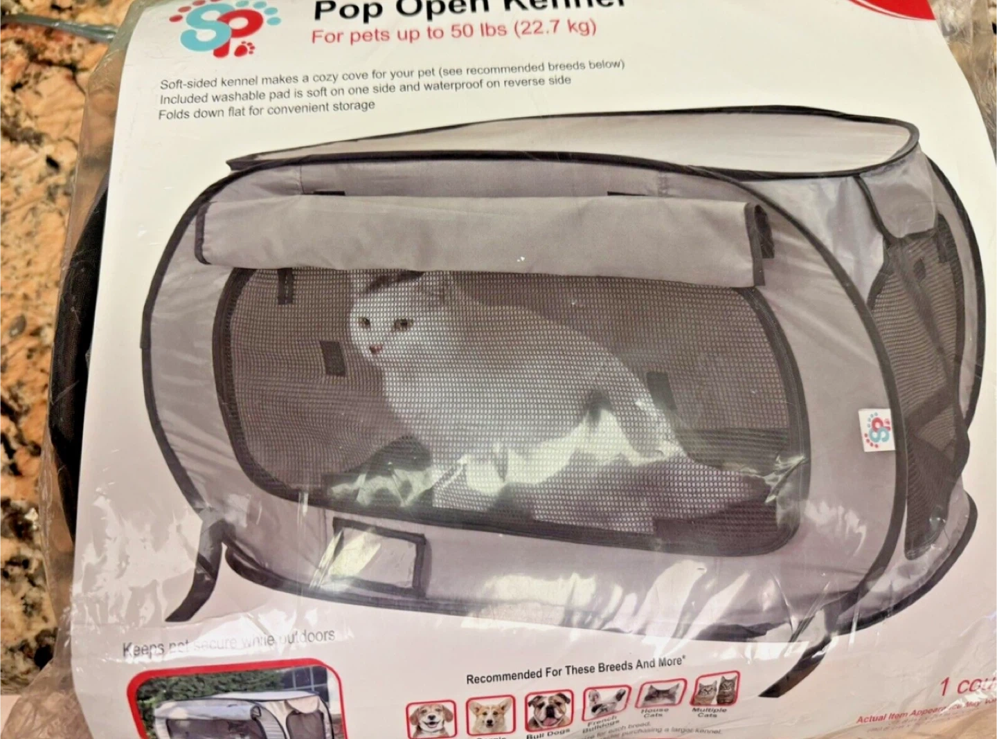 This SP Pop Open Kennel is perfect for pets up to 50 lbs! It's a soft-sided kennel that makes a cozy cove for your pet. It includes a washable pad that is soft on one side and waterproof on the reverse side. Folds down flat for convenient storage. The dimensions are 31.8" x 20" x 20". It also includes a draw-string bag for easy carrying