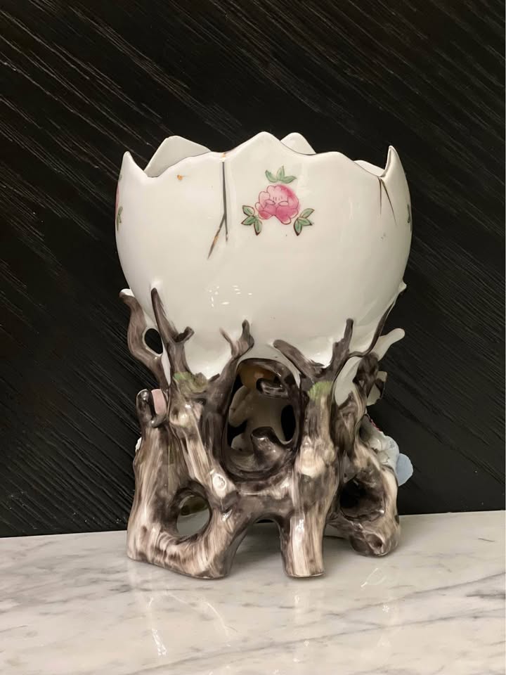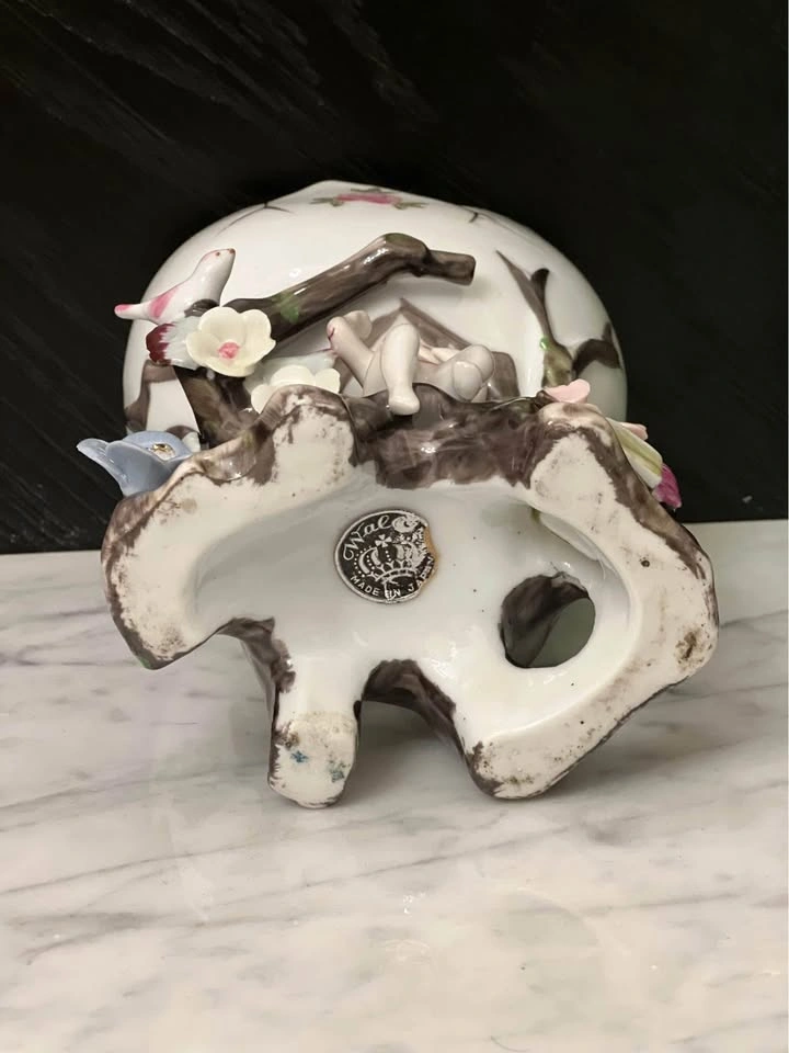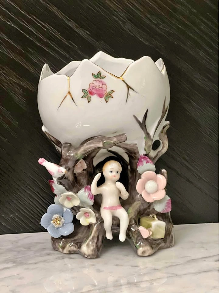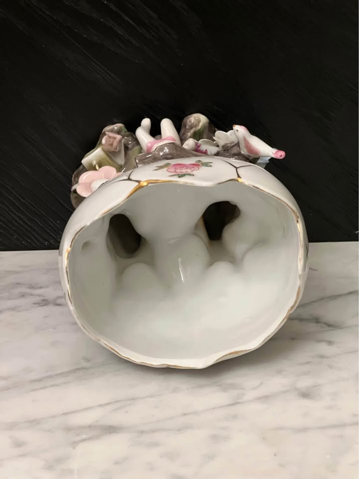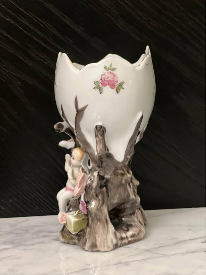 This vintage ceramic planter features a charming cherub design, perfect for adding a touch of whimsy to any space. Made in Japan (Wales), this piece is a unique addition to any collection of vintage items. Crafted with care, this planter is both beautiful and functional, making it an ideal choice for displaying small plants or succulents. Measurements: 6.5” tall 4” x 3” opening