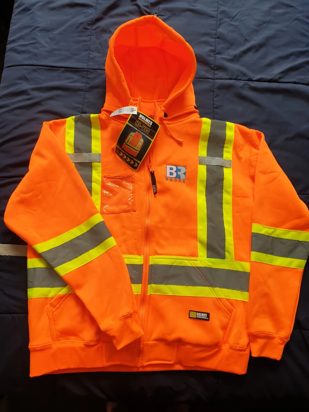 Bright orange hi-vis workwear hoodie from BR Brook. It features reflective tape for increased visibility. This is a high-quality fleece hoodie.