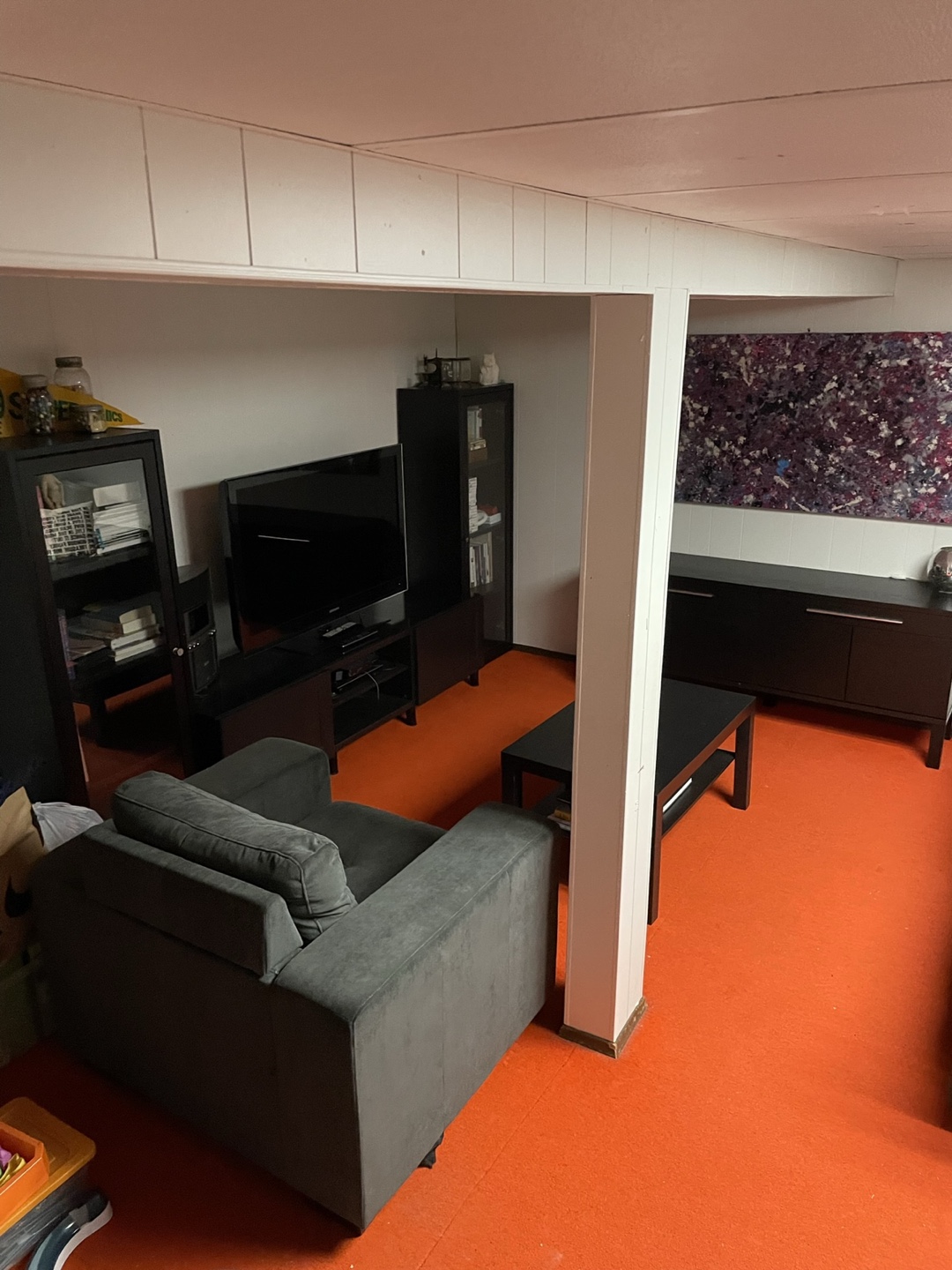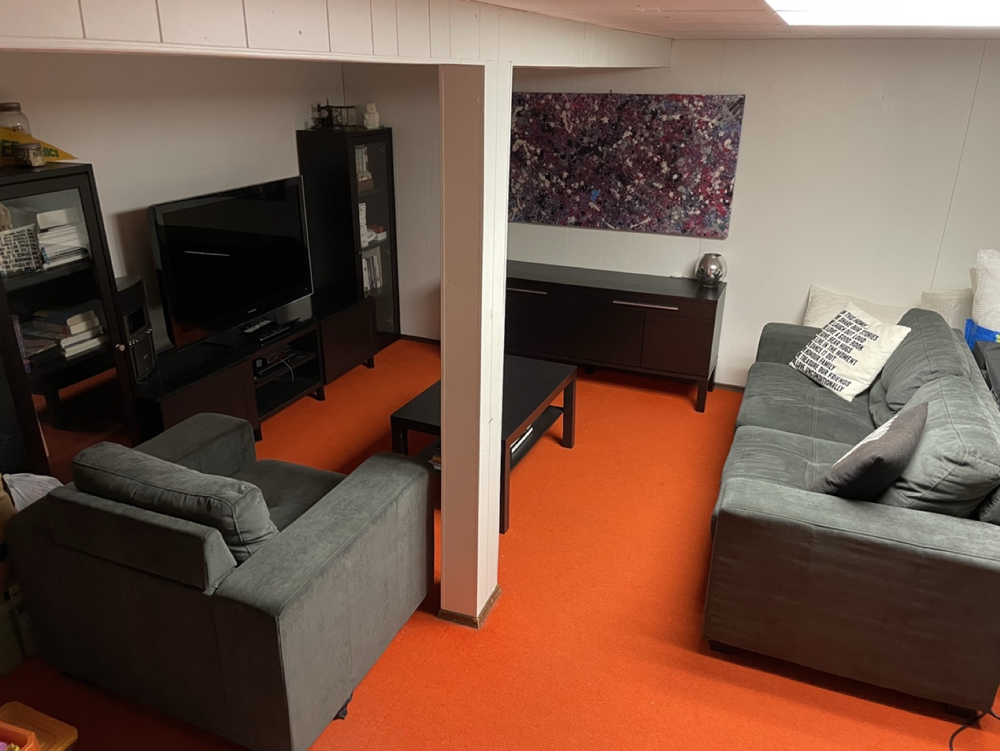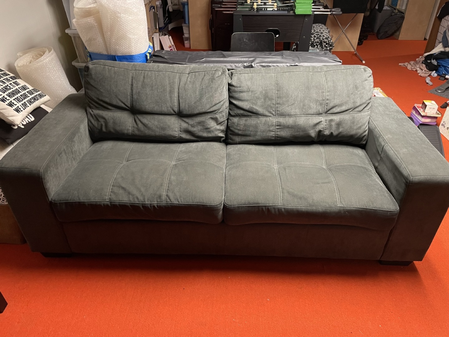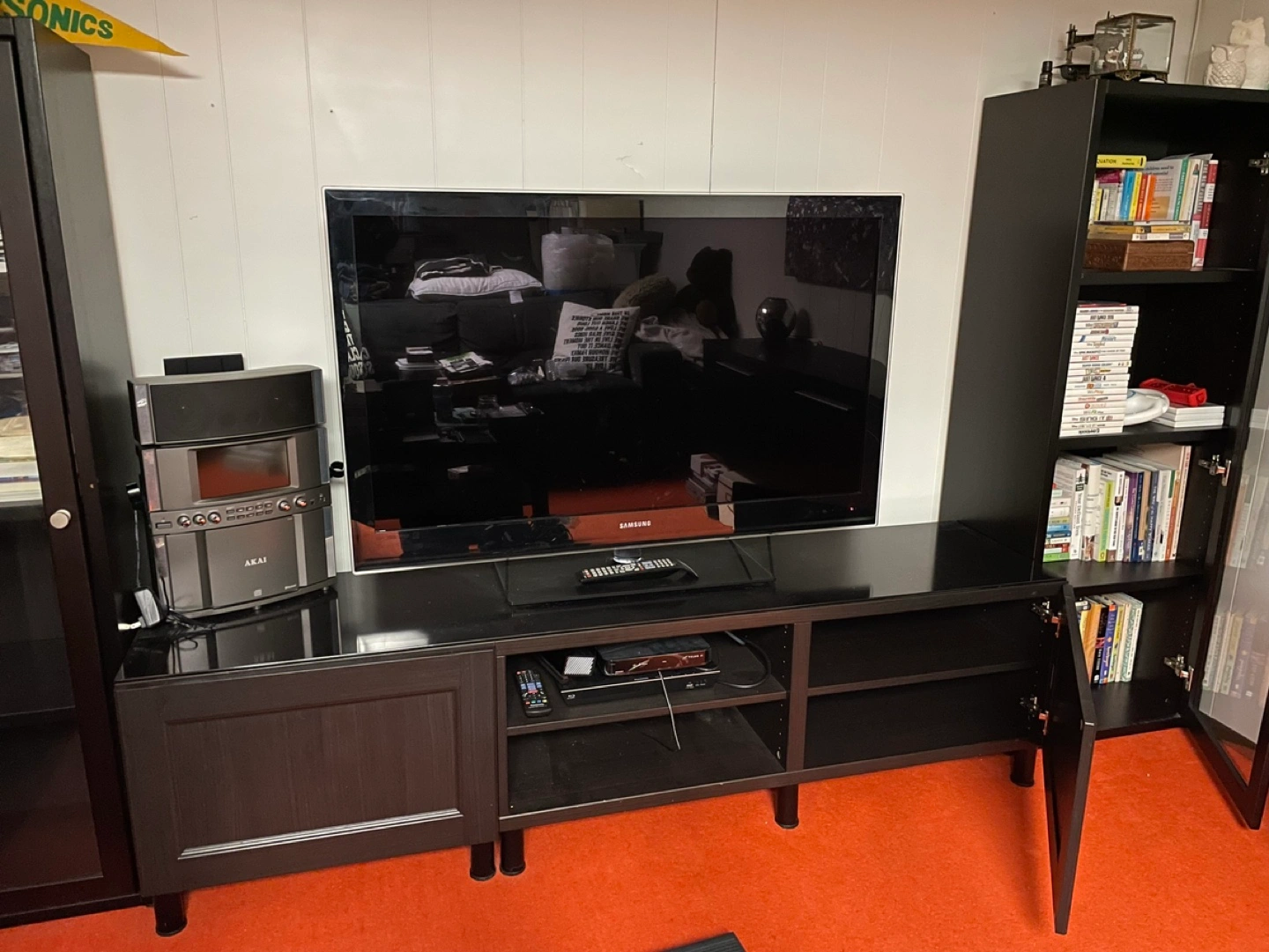 Full living room set up-sofa bed, chair, cabinets, tv, etc
