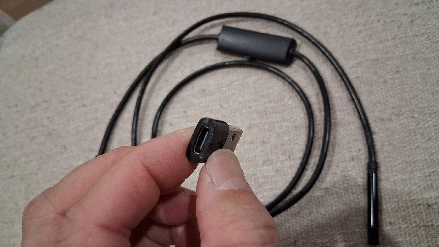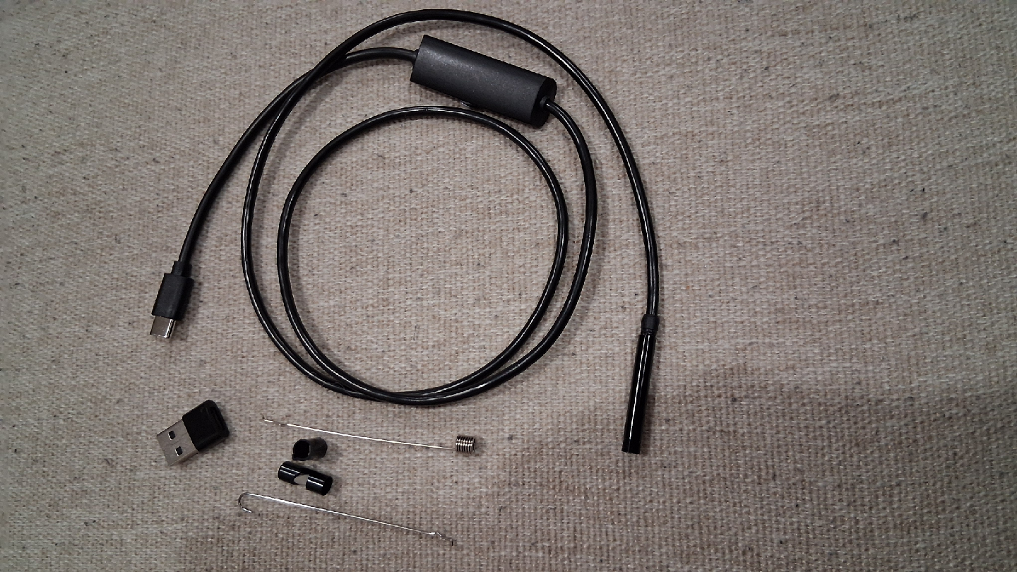 It comes with connect USB A to USB C, also with accessorize of 45 degree deflective mirror for 90 degree vision angle for hidden area. It comes with 2 different metal hooks for object retrieval.