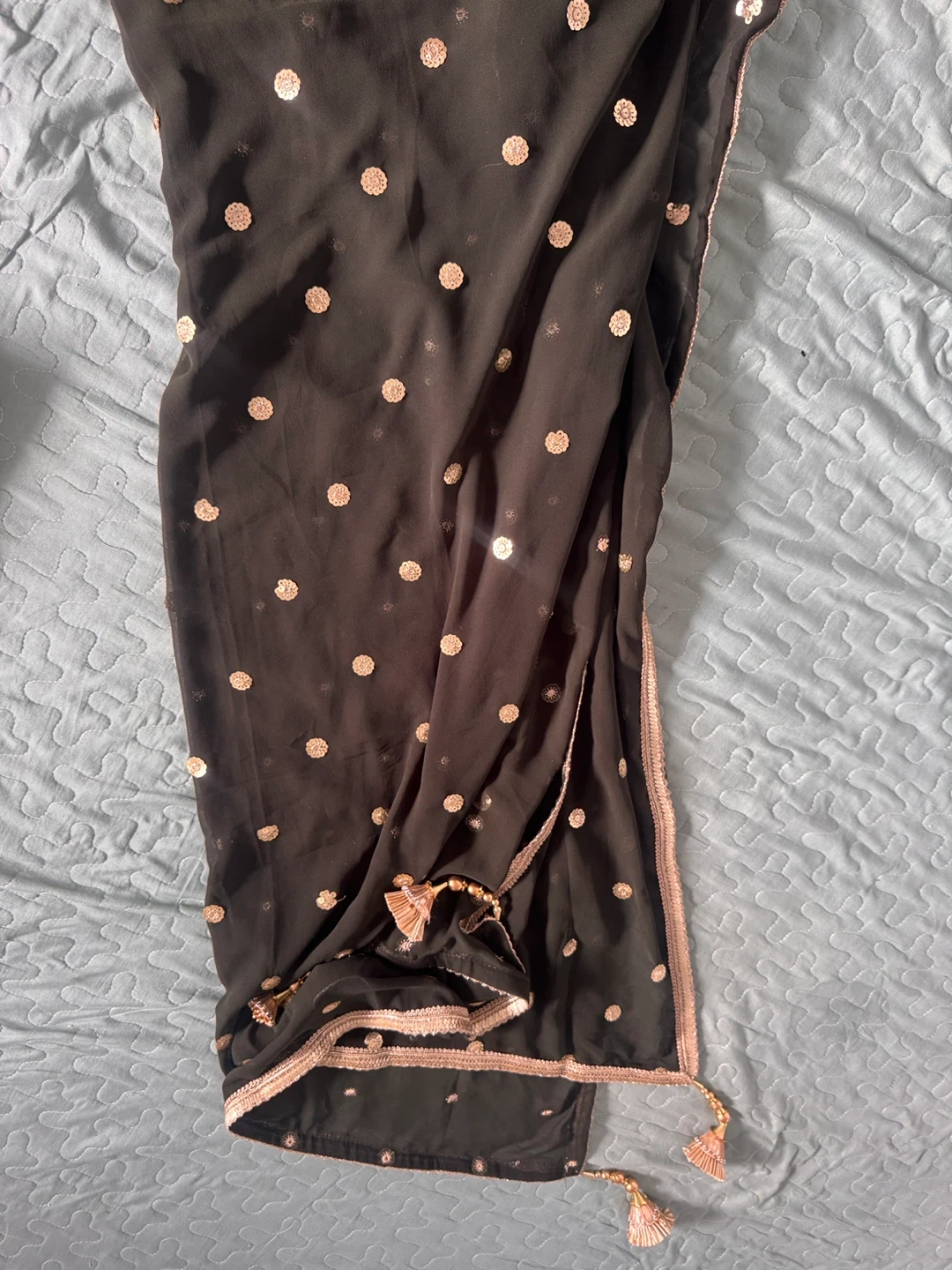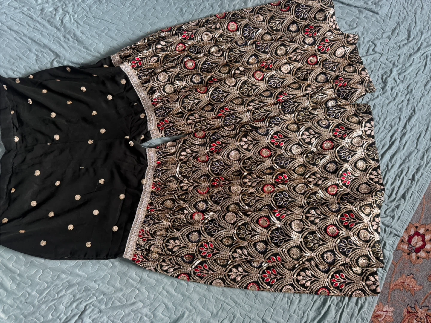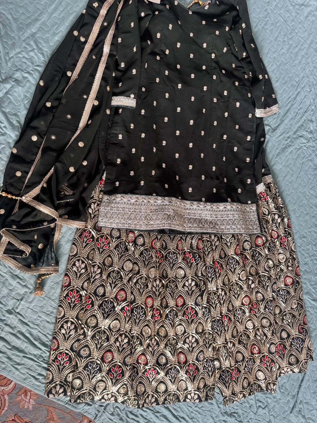 Beautiful black salwar kameez with intricate embroidery. The set includes the kameez (top), salwar (bottom), and dupatta (scarf). The fabric is lightweight and comfortable, perfect for special occasions or everyday wear! The embroidery features a mix of gold and red accents, adding a touch of elegance.