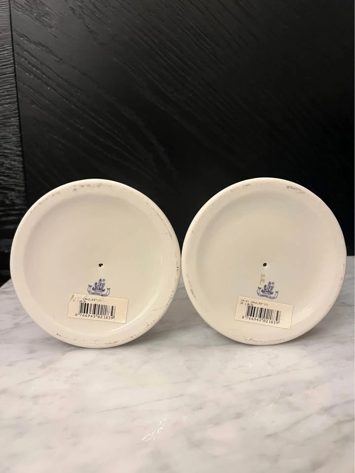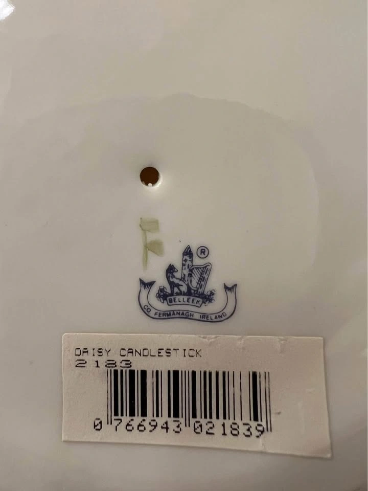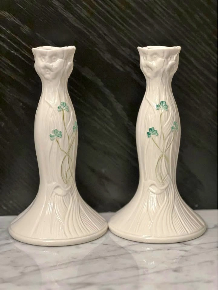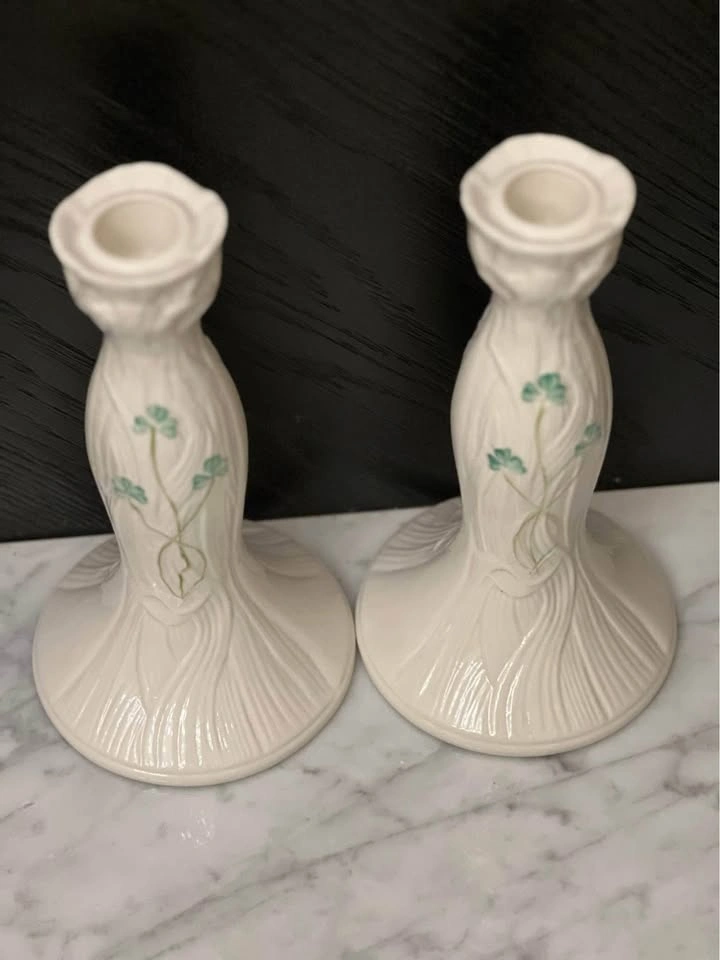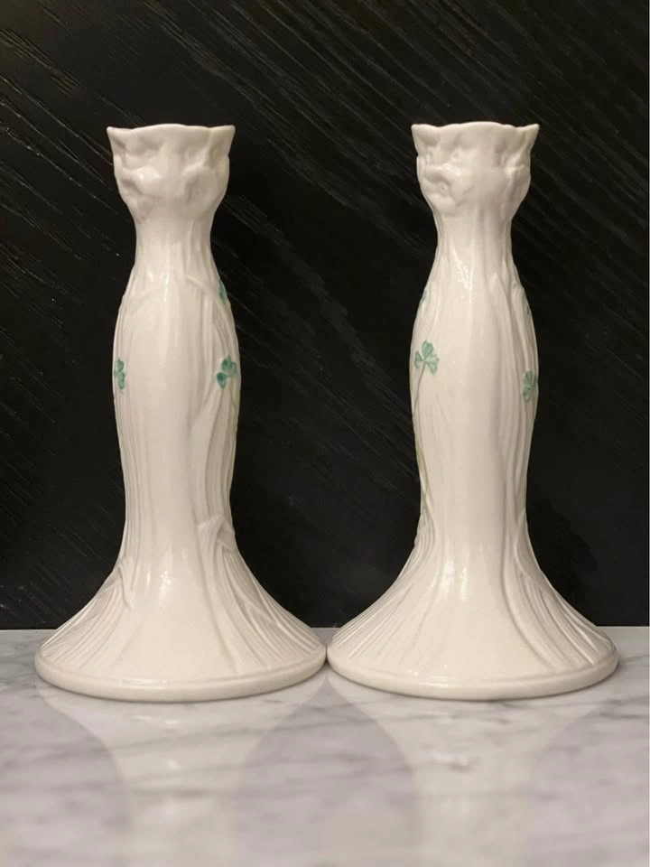 These candlesticks are the Belleek Shamrock Daisy Candlesticks. They are made of bone china in Ireland and are part of a classic pattern that has been in production since 2001, though the shamrock pattern itself dates back to 1946. The design features embossed daisies with hand-painted green shamrocks. Product Details: Manufacturer: Belleek Pottery (Ireland) Pattern: Shamrock Daisy, also referred to as Daisy Giftware Material: Bone china Height: Approximately 8.25 inches Suitable for: Taper or dinner candles
